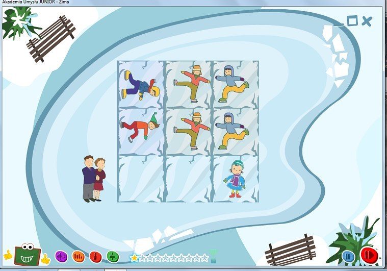 Łyżwy – trzeba dziewczynkę przeprowadzić przez lodowisko do rodziców. Nie jest to proste, bo inne dzieci jeżdżą po lodzie. Trzeba tak je przesuwać by dziewczynka przeszła po prostej linii do mamy i taty.