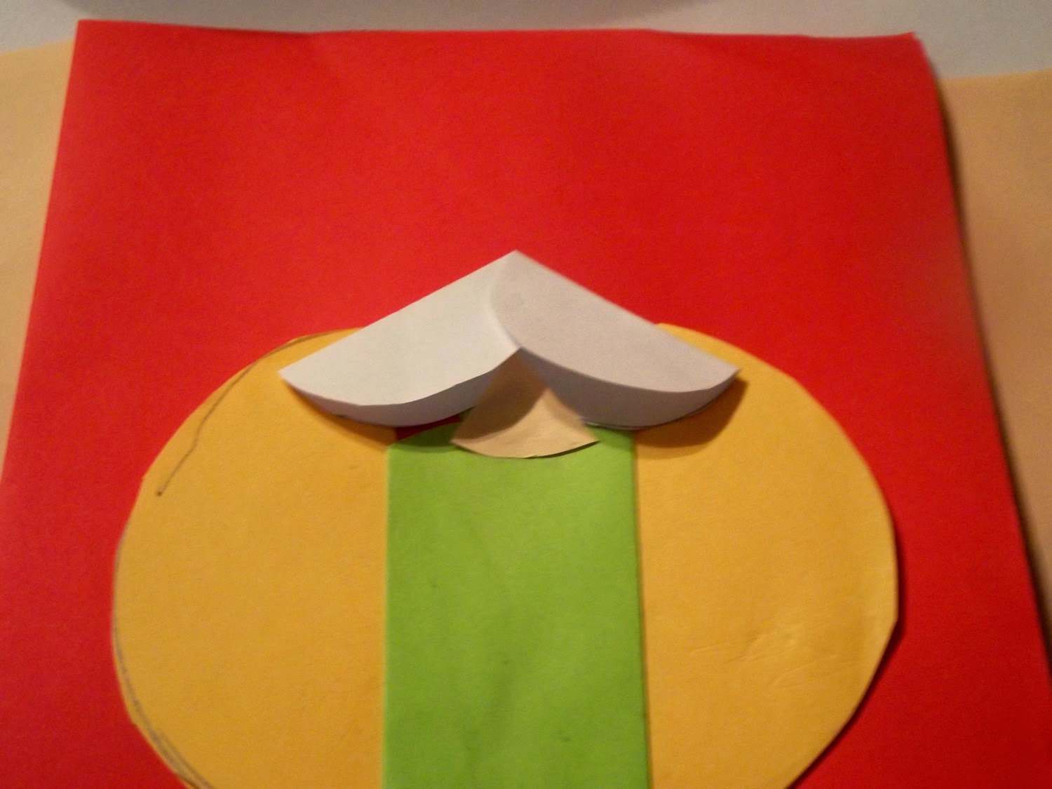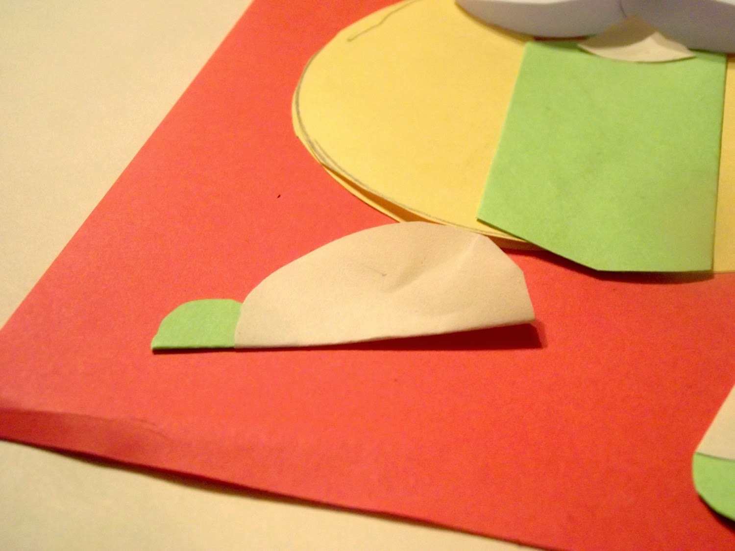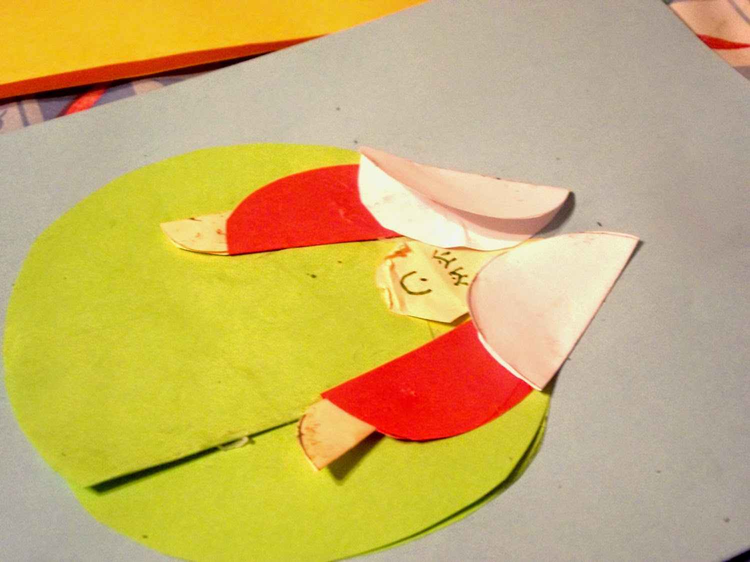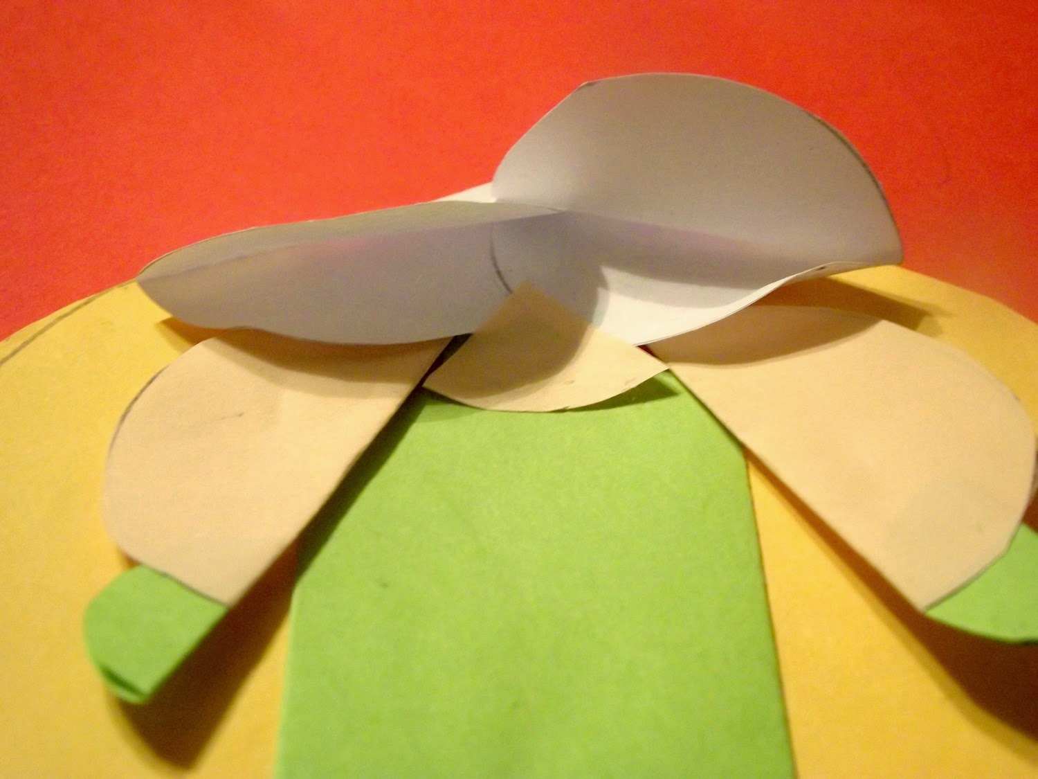 Białe kółeczka złożyć na pół, przykleić pod skosem tworząc włosy. Gdzie widać „skórowy” trójkąt, jest tam też małe kółeczko zielone. Tak trzeba było zrobić – nauczyciel przykazał.