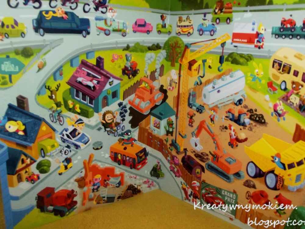 Auta – jak sama nazwa mówi dużo samochodów. Bardzo dużo ludków, każdy zajmuje się czymś innym. Można też układać własne historyjki. Bystre oko wypatrzy Rolnika Leona, Kotka Urlopka czy Profesora Śmigiełko.