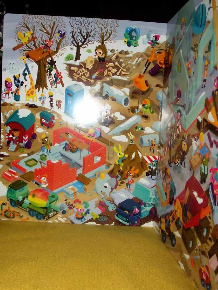 Na budowie – tu każda strona to inna pora roku. W każdej z nich budowa posuwa się do przodu. Obserwujemy jak szybko budują domy, jak rozkwita drzewo, powstaje basen.