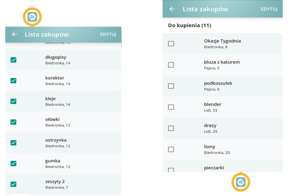 Szybko, prawda? Teraz pora przejrzeć dostępne gazetki. Gdy zainteresuje Cię coś z gazetki, wystarczy kliknąć ikonę karteczki zakupowej,  a zdjęcie zapisze się w aplikacji.