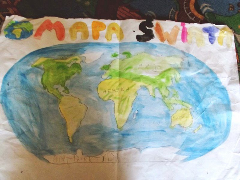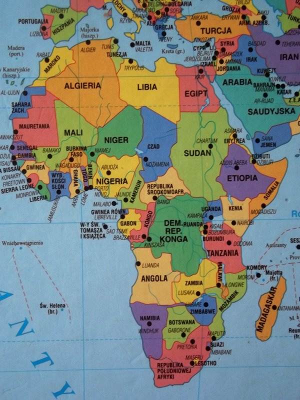 Najpierw trzeba się zorientować, gdzie leży Afryka, jaki ma kształt. Brakuje tylko globusa Nam do pełni oglądania. Tymczasem mapie zaznaczyłam, który to kontynent. Na mapie świata podzielonej na państwa, bliżej można się zapoznać z nimi i które z nich są suche, które rejony to dżungla, a które Sawanna.