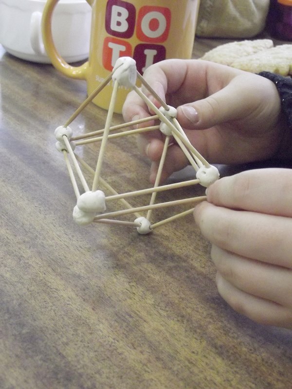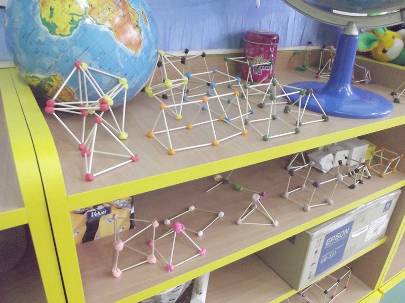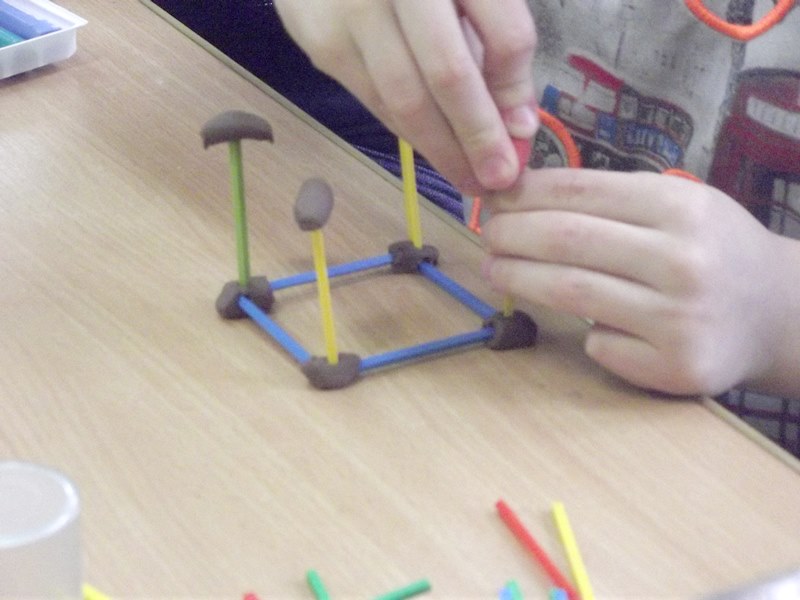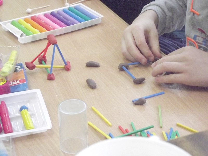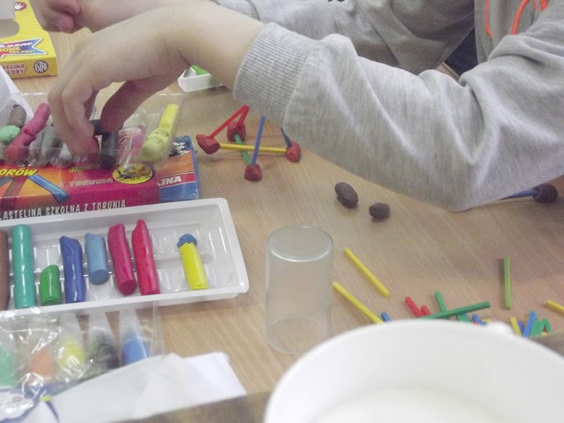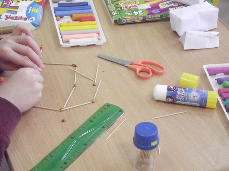 5. Kolejnym punktem były bryły i figury robione z patyczków/wykałaczek i plasteliny. Prędzej podobne robiły już prędzej, ale teraz mieli pełną dowolność w tworzeniu. Powstały nawet gwiazdy, ludziki, „trójkąty przyszłości” i inne kształty. Same patrzenie jak tworzą kolejne ciekawe pomysły to sama radość. Gdyby mogli jeszcze przez godzinę tworzyli by cuda.