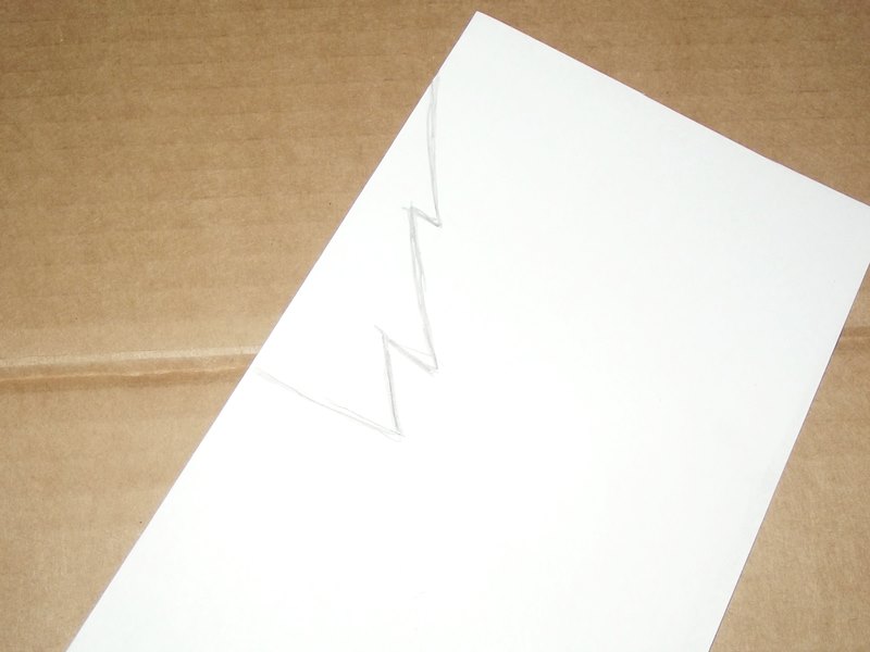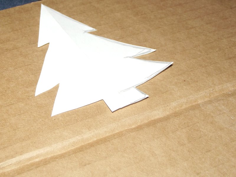 Wytnijcie 2 takie same choinki z tektury. Zaznaczcie na choinkach linie. Na jednej od góry, na jednej od dołu do około 3/4 wysokości. Wytnijcie cienkie paseczki na linii.