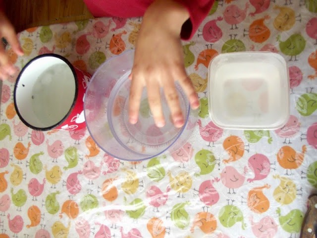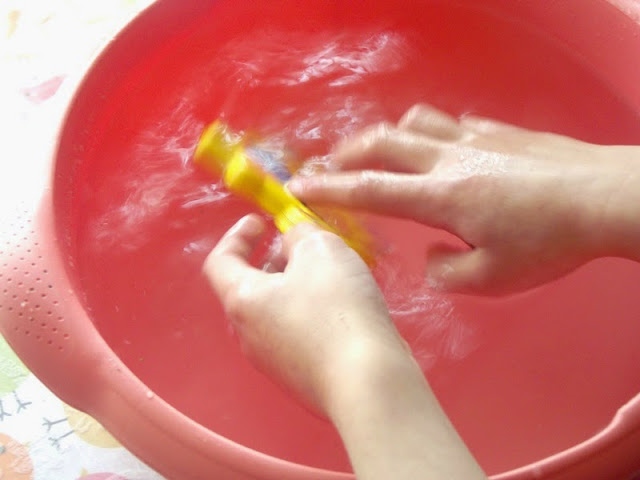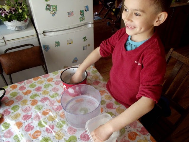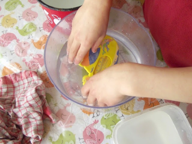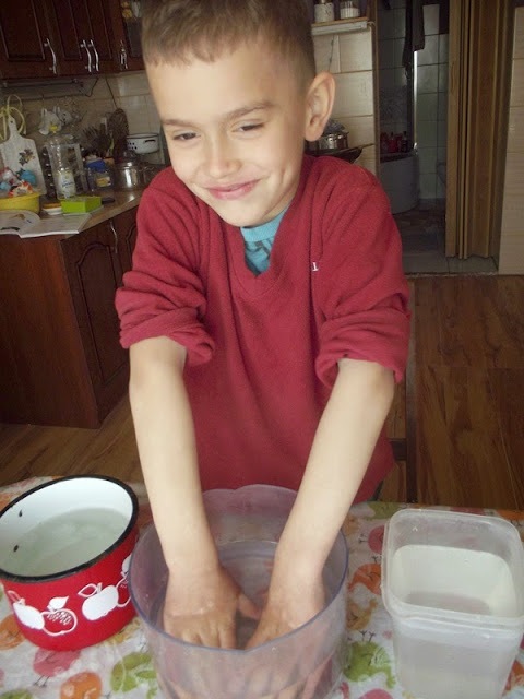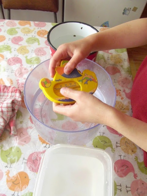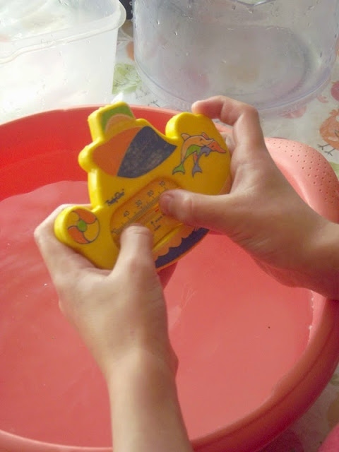 Podobnie jest gdy ręce/nogi sobie odmrozimy w zimę. Śnieg działa bardzo niską temperaturą na nasze ciało, a gdy wchodzimy do ciepłego domu lub gdy wkładamy ręce do letniej wody, wydaje nam się że jest ona gorąca. Aż parzy. Potem Adaś bawił się jeszcze długo wodą. Przelewał, dolewał, sprawdzał odczucia i temperaturę i poznawał nowe rzeczy. Świetna zabawa a do tego edukacyjna!