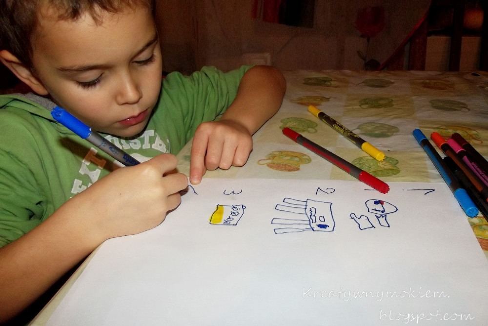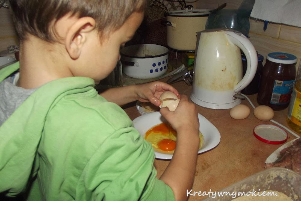 Później już sam obtaczał w jajku i bułce. Pobabrał się trochę, powygłupiał ale pomógł bardzo.