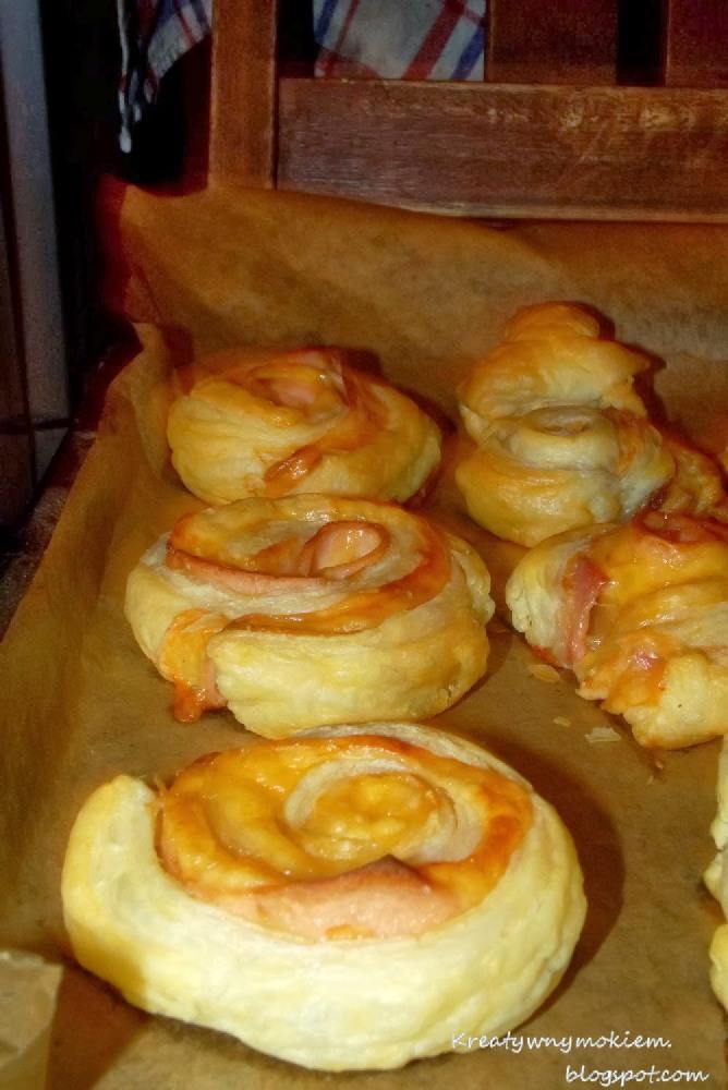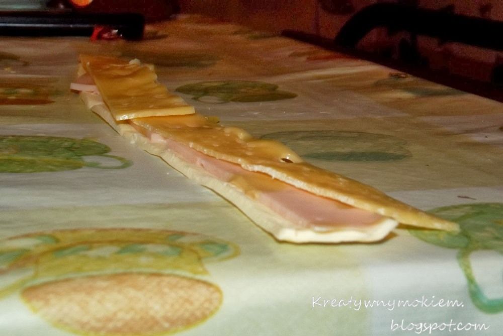 Pasek ciasta o szerokości około 2,5 cm. Na to kładliśmy szynkę oraz ser i bardzo luźno zwijamy i na blaszkę.