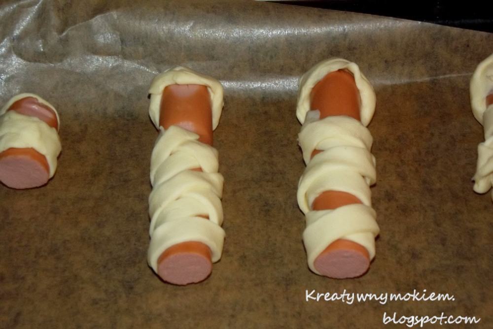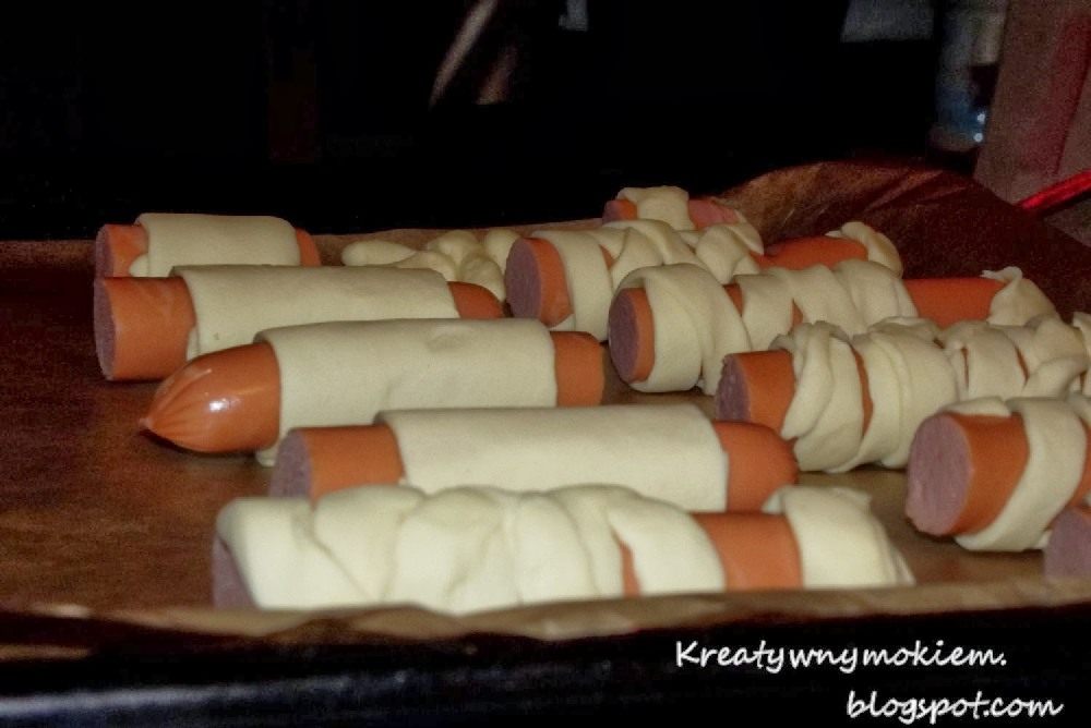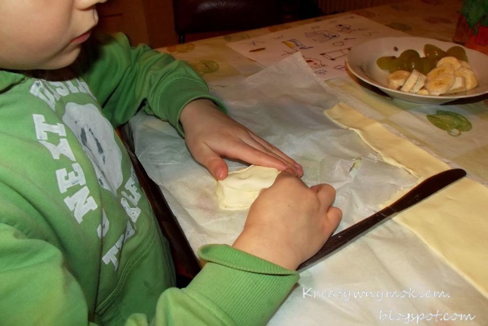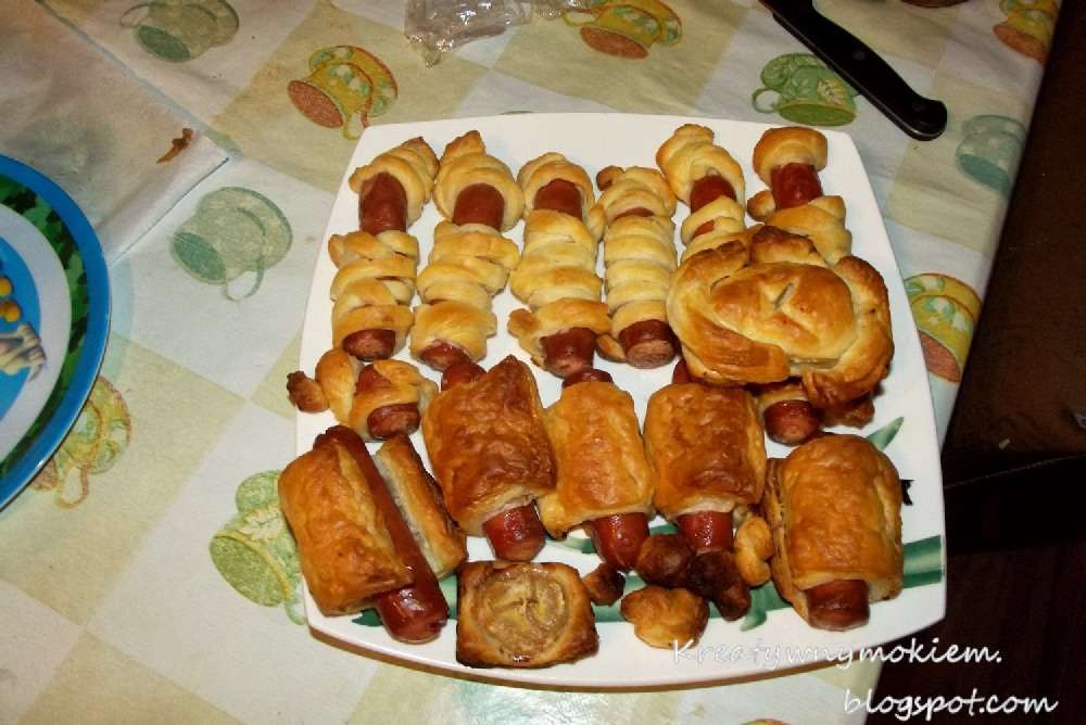 Potem był czas na deser i kolację. Zakupiliśmy 3 wałeczki gotowego ciasta francuskiego w Biedronce ( zawsze jest ok). Powstały z tego mumie, coś na słodko, pizze i kiełbaski w cieście.