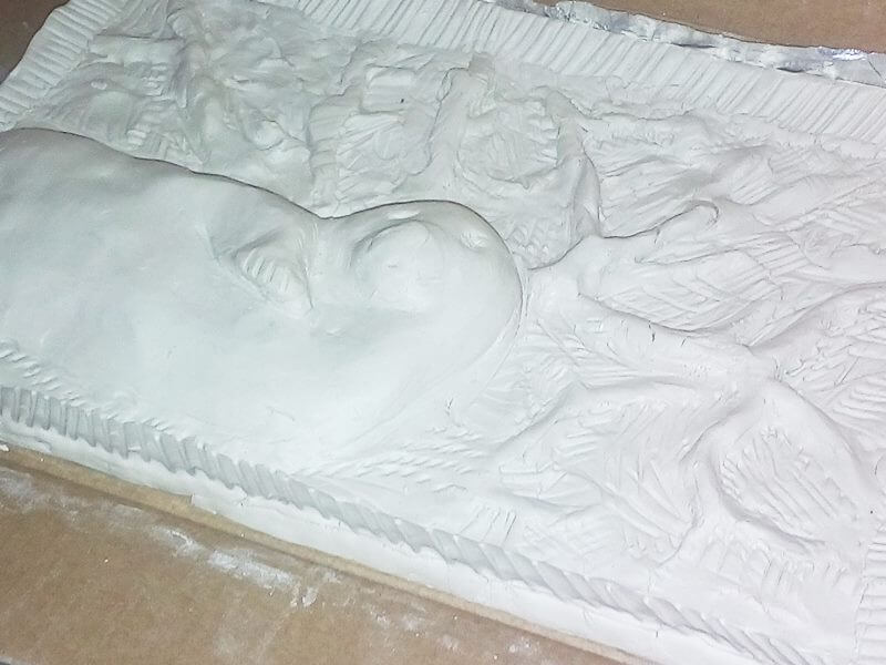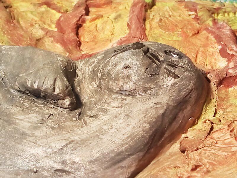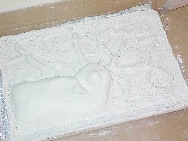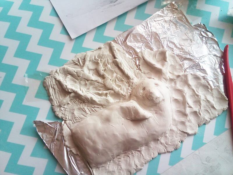 - Przy pomocy plastikowego nożyka od ciastoliny formowałam garbki, wgłębienia, miejsce na oczy, a także gałązki, które widać w tle.