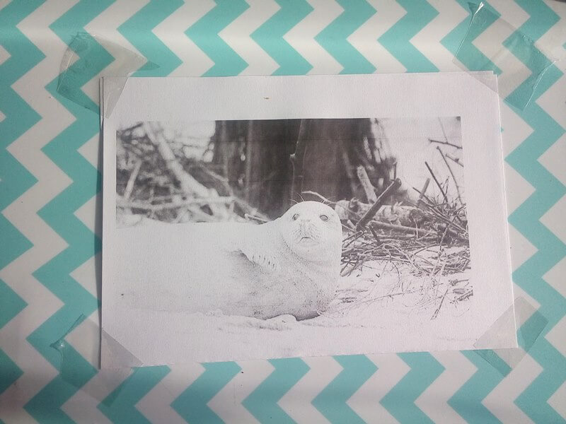 - Wydrukowałam sobie zdjęcie foki, a następnie przykleiłam je delikatnie do maty by nie przesuwało się podczas pracy.