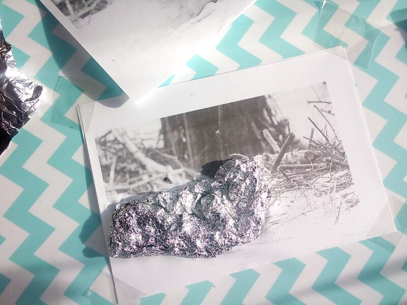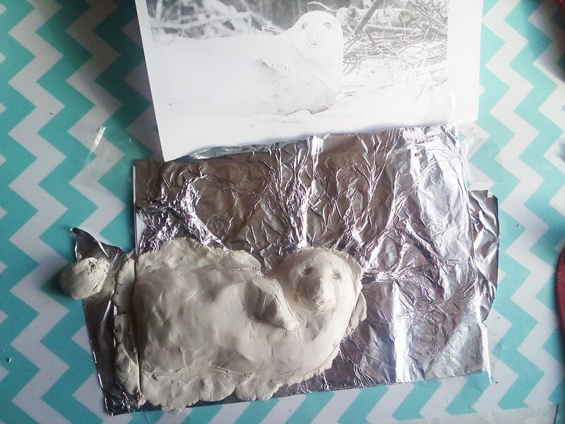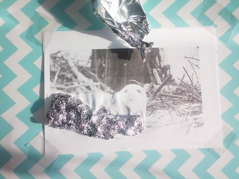 - Z folii aluminiowej utworzyłam pierwotny kształt foki, przyklejając za pomocą kleju do zdjęcia. Uważałam, by głowa czy płetwa była bardziej wypukła.