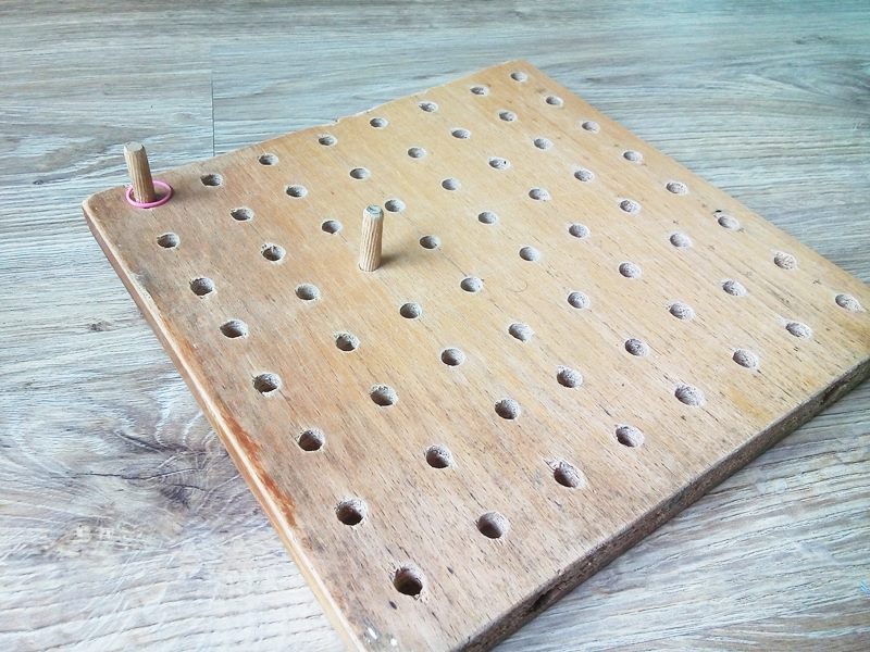 Jeśli chodzi o kołeczki, są dwie opcje. Można je umocować na stałe w desce lub rozstawić je ruchome. Adaś wybrał drugą opcję. Osobno ma deskę i osobno kołki, które może wkładać w te miejsca, które pasują do wykonania zadania.