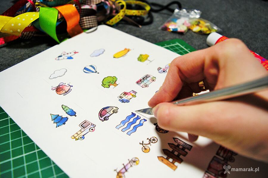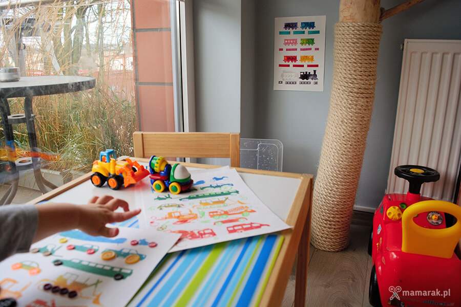 Teoretycznie jedną wersję chciałam powiesić na ścianie, ale moje dziecię nie chce się z żadną rozstać 😉 Tej mamy już kilka wersji. W pozostałych dorysowaliśmy koła samodzielnie i przymierzamy do pojazdów wszystko co okrągłe. To doskonałe ćwiczenia dla każdego przedszkolaka! 🙂
