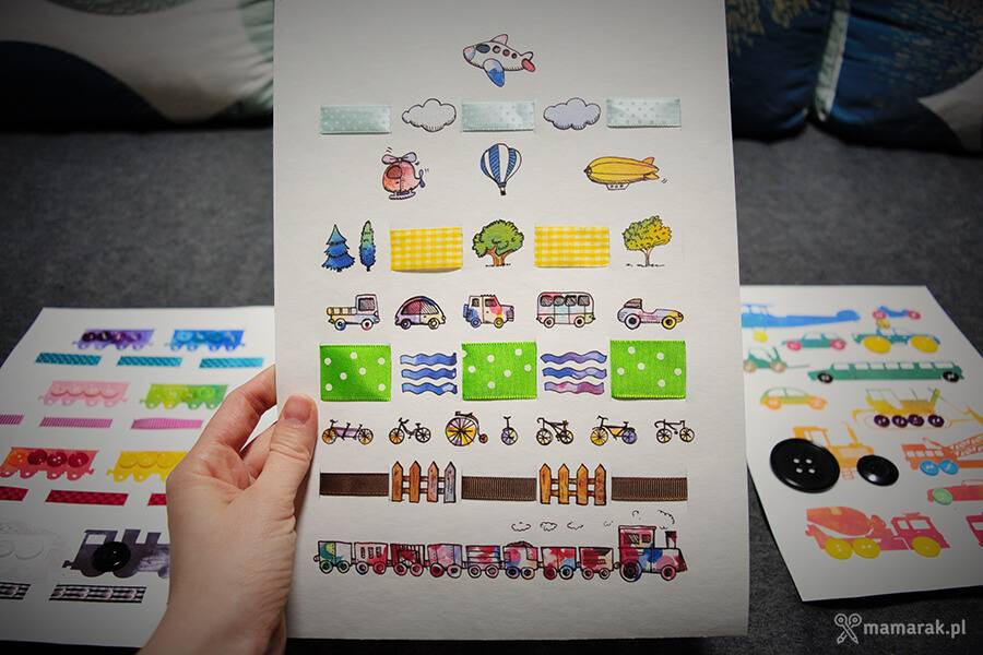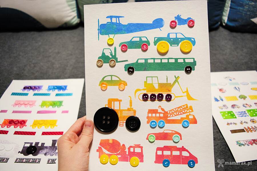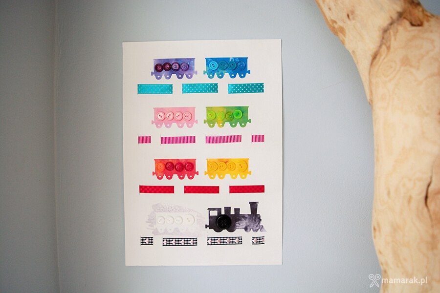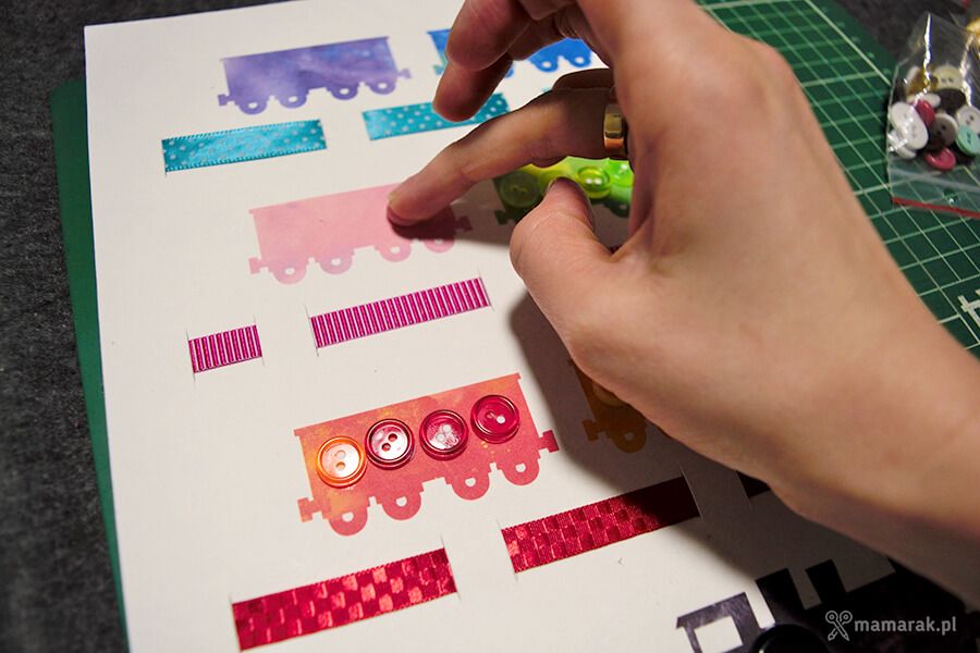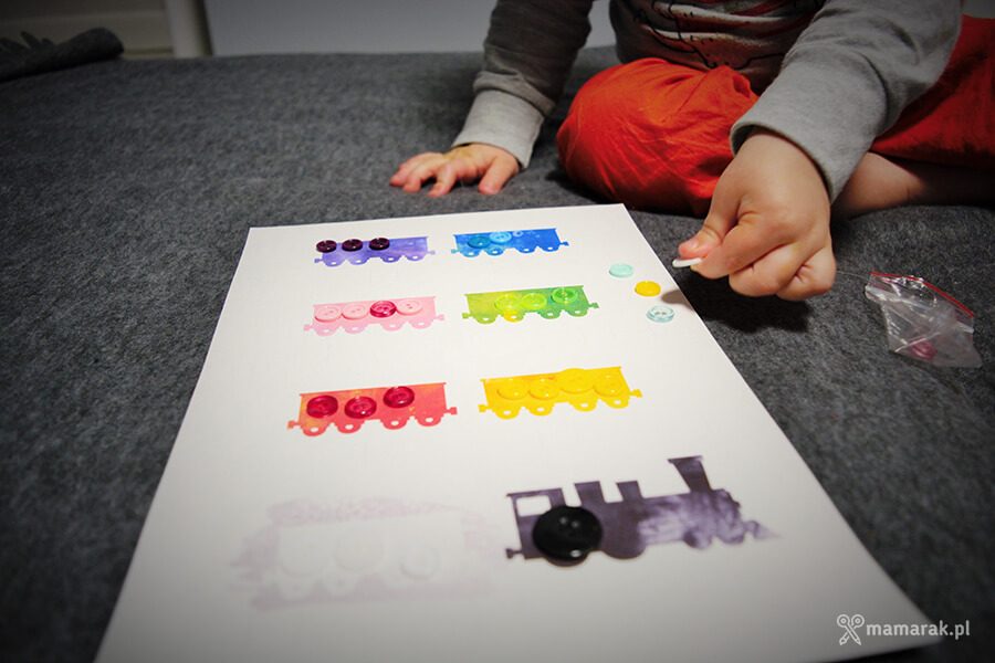 2. Guziki segregujemy kolorami i przyklejamy na wagoniki.
