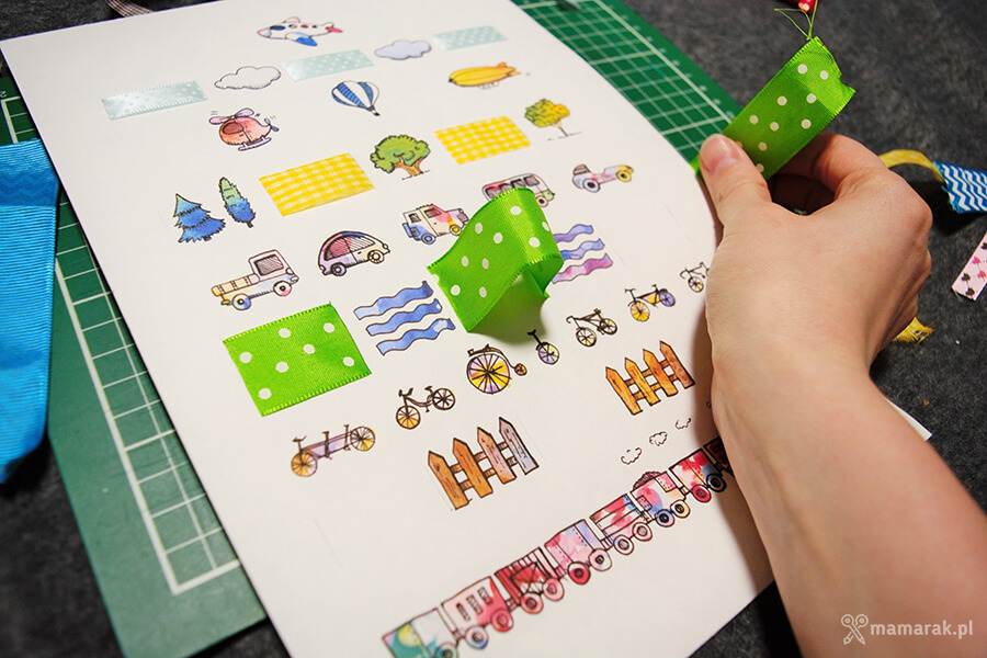 2. Komponujemy i wplatamy wstążki. Mój syn jest jeszcze za młody na samodzielne wplatanie wstążek, ale dla starszych dzieci to doskonałe ćwiczenie manualne. Można też wykorzystać paski wycięte z bloku papierów kolorowych. Przedszkolaki i dzieci szkolne same mogą ozdobić je szlaczkami.