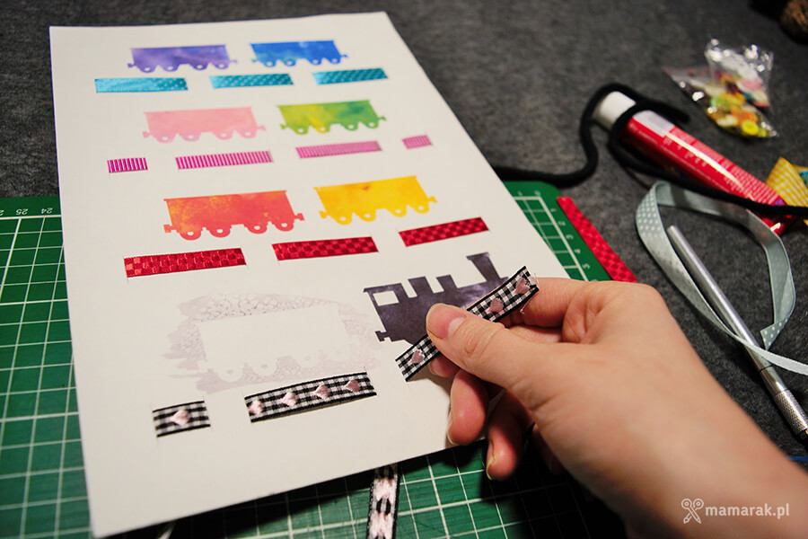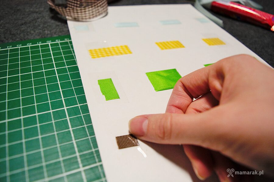 3. Docinamy wstążeczki i podklejamy je od tyłu taśmą.