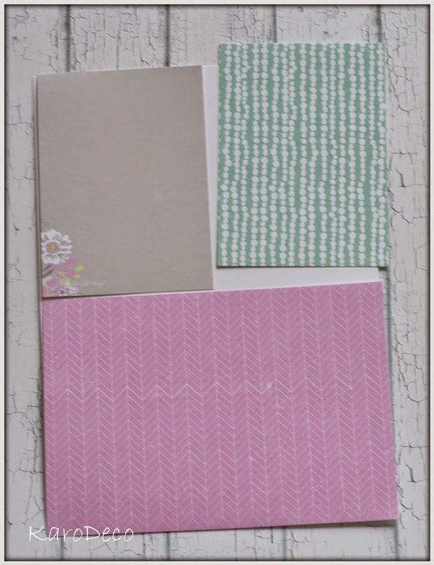 Przygotowujecie sobie bazę papieru pod wymiar koszulki. W tym wypadku to 15×21 cm-A5. Dobrałam trzy różne wzory papierków, pocięłam je na kawałki 10×15 (tutaj może być po prostu zdjęcie) oraz dwa kawałki 10×7,5cm.