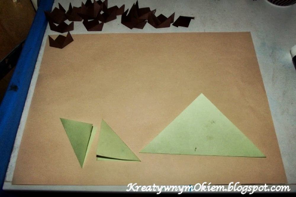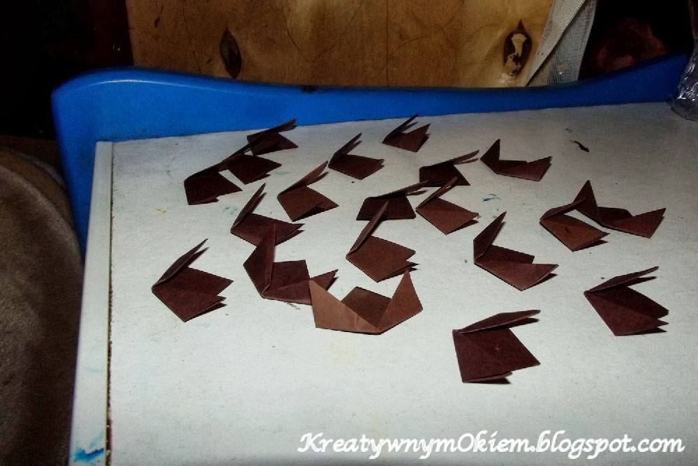 Gdy mamy złożone na pół kolce, teraz trzeba zrobić by tak wyglądały. Kładziemy przed trójkącik dzióbkiem do przodu. Boczki zaginamy do góry. Na zdjęciu chyba dobrze widać.