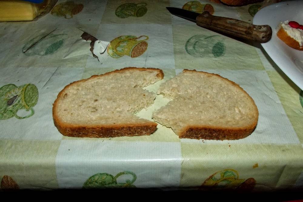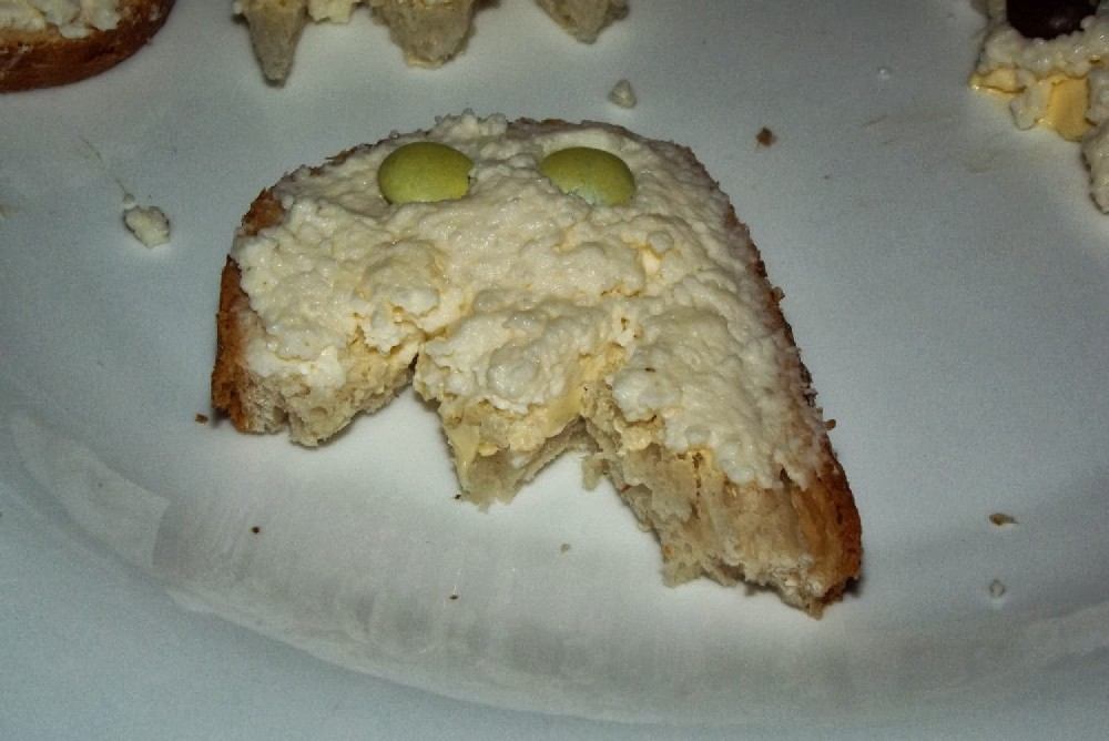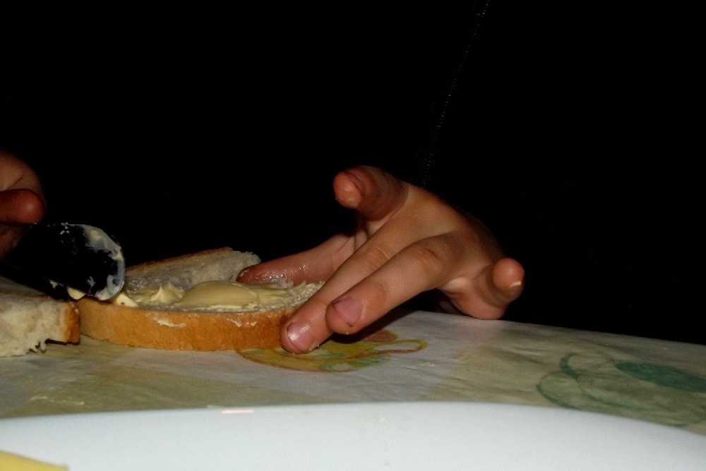 Potrzebna będzie pomoc dorosłego! Ostrym nożykiem przecinamy kromkę chleba na pół, ale zygzakiem. To będzie dół Naszego Duszka. Przygotowujemy składniki, dajemy dziecku nożyk do masła i niech działa.