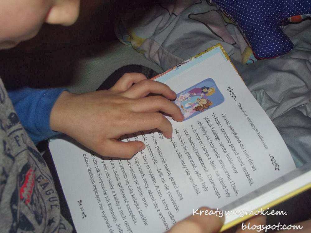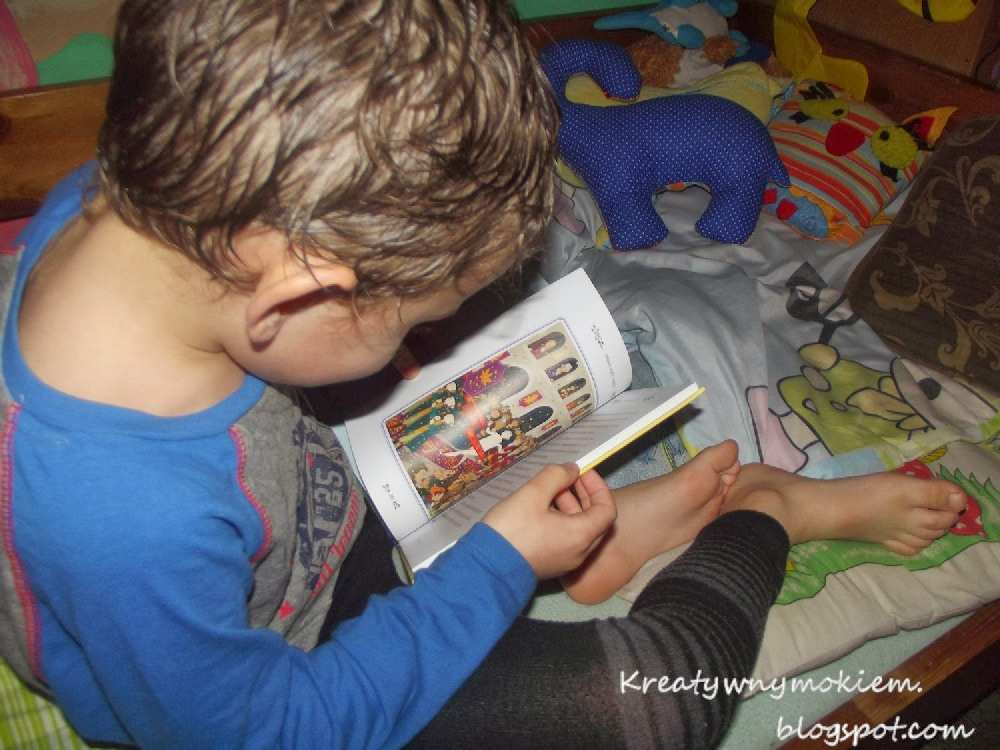 Adaś lubi oglądać obrazki jak mu czytam, więc dla niego to jest miły dodatek. Ja czytam on słucha i wyłapuje szczegóły z ilustracji, które łączy z tekstem.