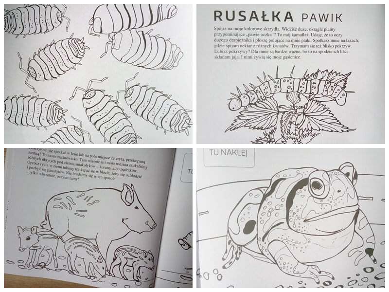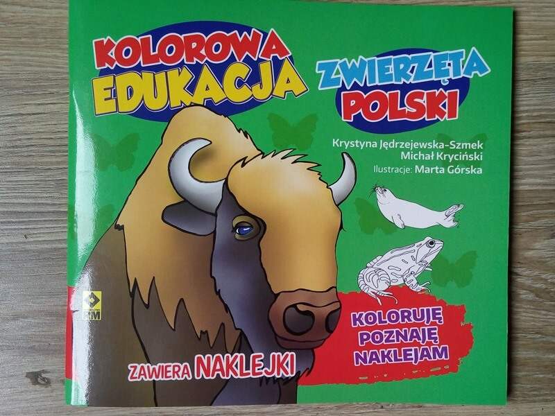 Druga książka-kolorowanka dotyczy zwierząt zamieszkujących w Polce. Układ jest taki sam jak powyżej. Tutaj również znajdziecie na naklejkach zdjęcia zwierząt. Opisy zwierząt pisane są w 1 osobie. Każde zwierzę czy ptak opisuje siebie, rodzinę i środowisko w którym mieszka. Nie ma tu wyszukanych zwierząt a takie ogólnie znane jak dzik, foka, wilk, stonoga czy zaskroniec.