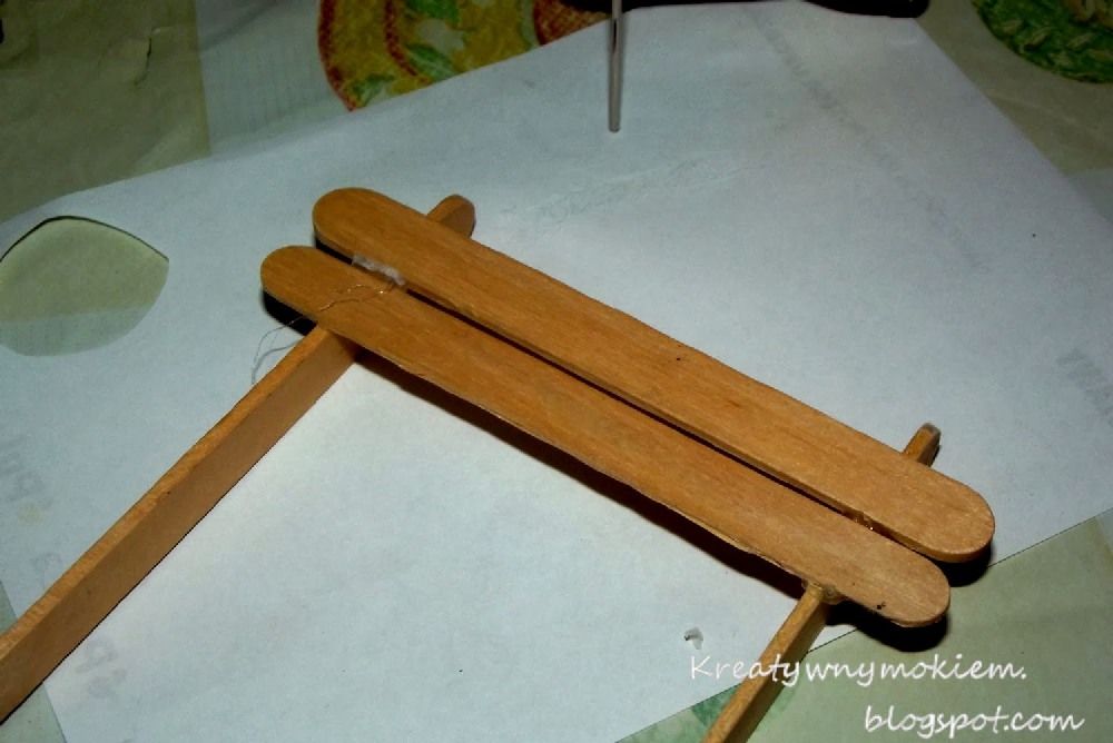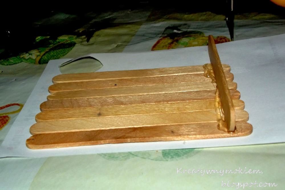 Układamy obok siebie 6 patyczków równolegle. Smarujemy klejem z jednego boku patyczki ( w poprzek) i przyklejamy kolejny patyczek pionowo, czyli jest do pozostałych prostopadle. Tak samo robimy po drugiej stronie.