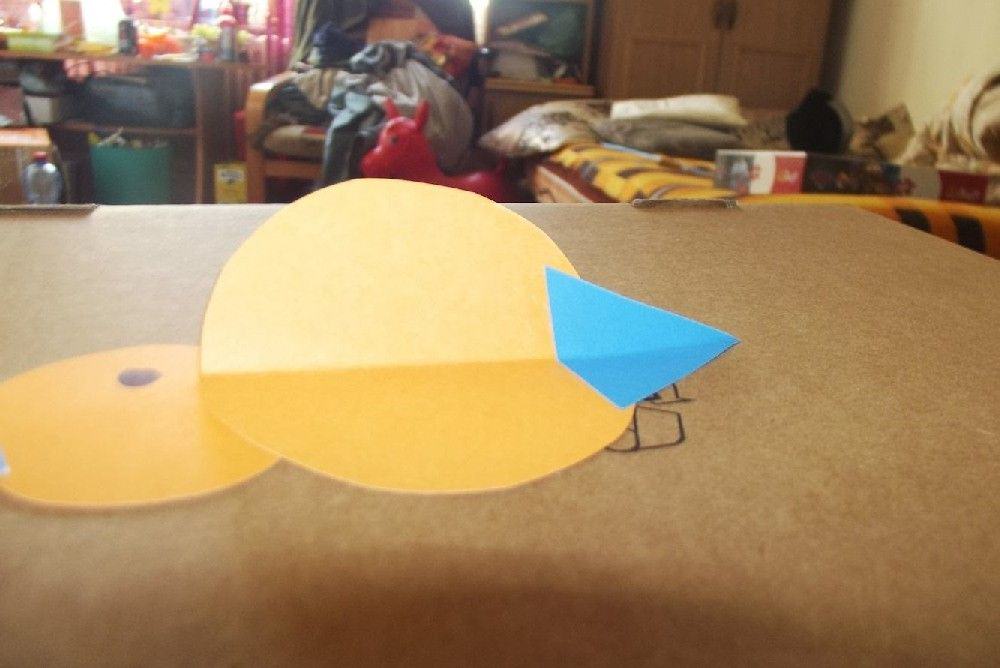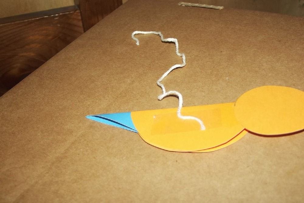 Ptaszek prawie gotowy. Jeszcze taśmą przykleimy sznureczek od lewej strony.