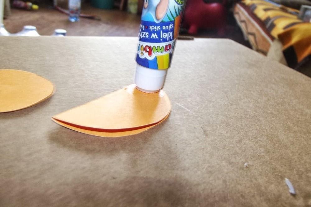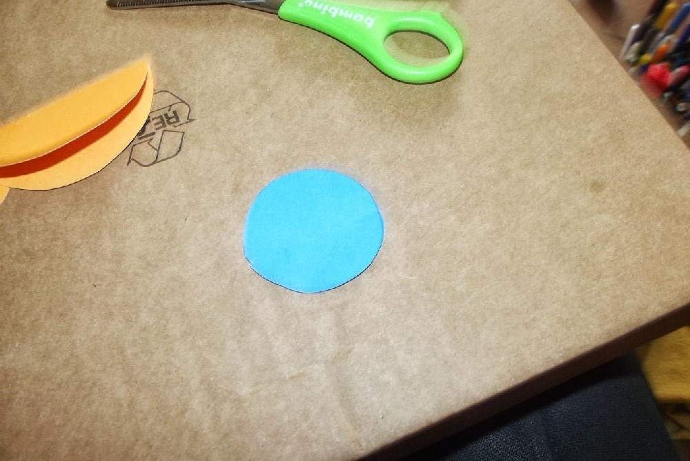 Niebieskie kółeczko złożyliśmy na pół i przecięliśmy po linii zgięcia -to będzie skrzydełko. A tak się składa ptaszka. Duże kółko zginamy na pół i smarujemy klejem z jednej strony.