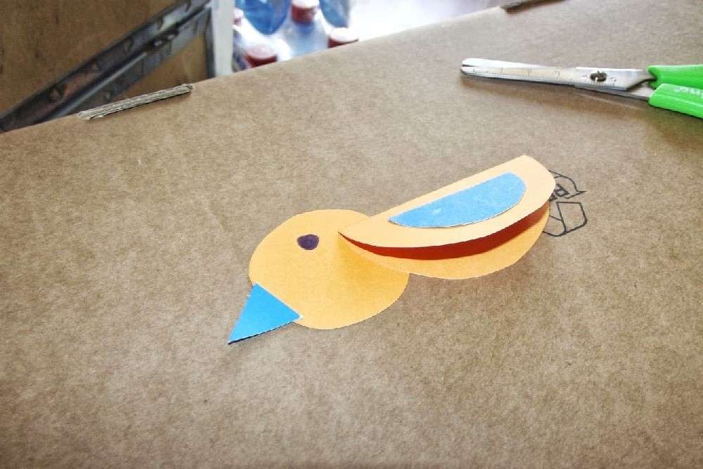 Pisakiem namalowaliśmy oczko i z małego trójkąta jest dzióbek. Jest też już skrzydełko.