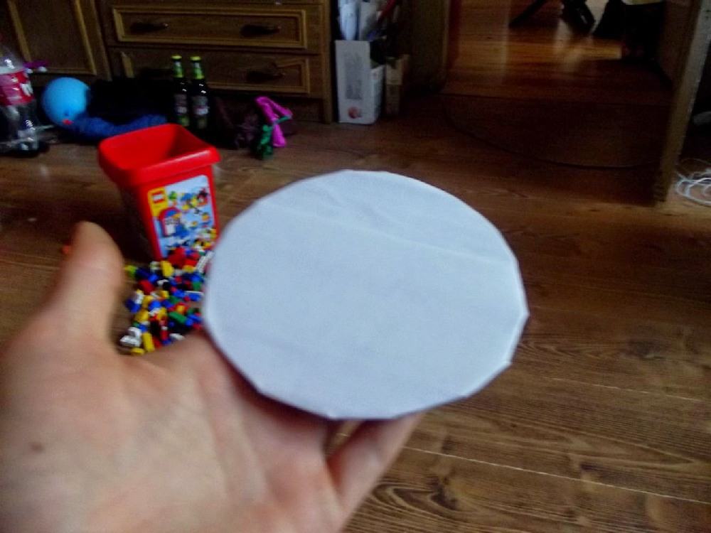 Zaczynamy od obklejenia białym papierem kółka. Ja miałam arkusz papieru z klejem.
