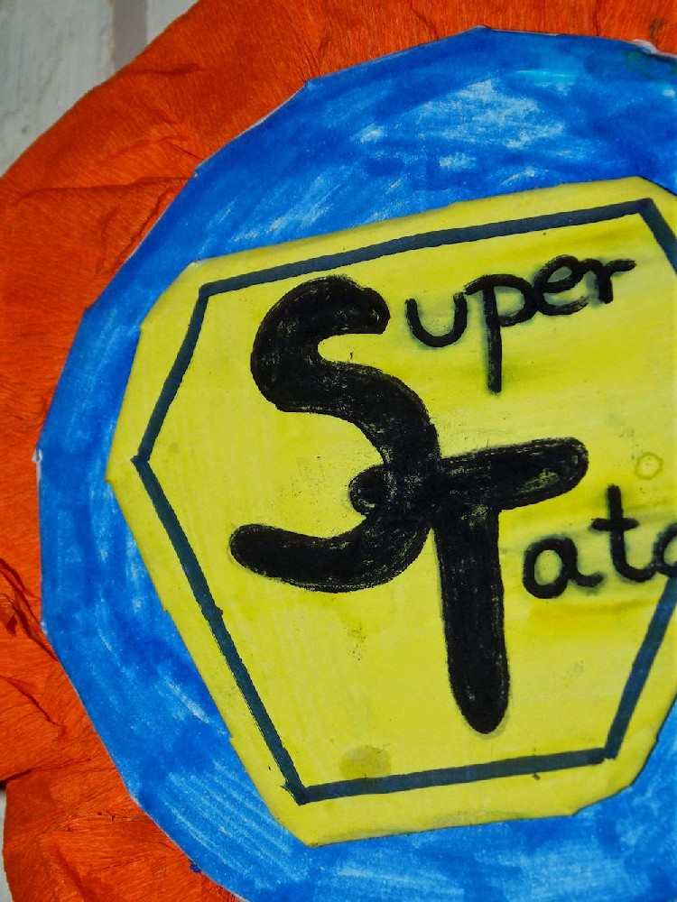 Żółta farbką pomalowane. Po wyschnięciu Czarnym pisakiem poprawiliśmy napis a niebieskim zrobiliśmy ramkę. Białe kółko pisakiem zrobiliśmy na niebiesko. Gdy wszystko było suche dwustronną taśmą skleiliśmy napis i kółko.