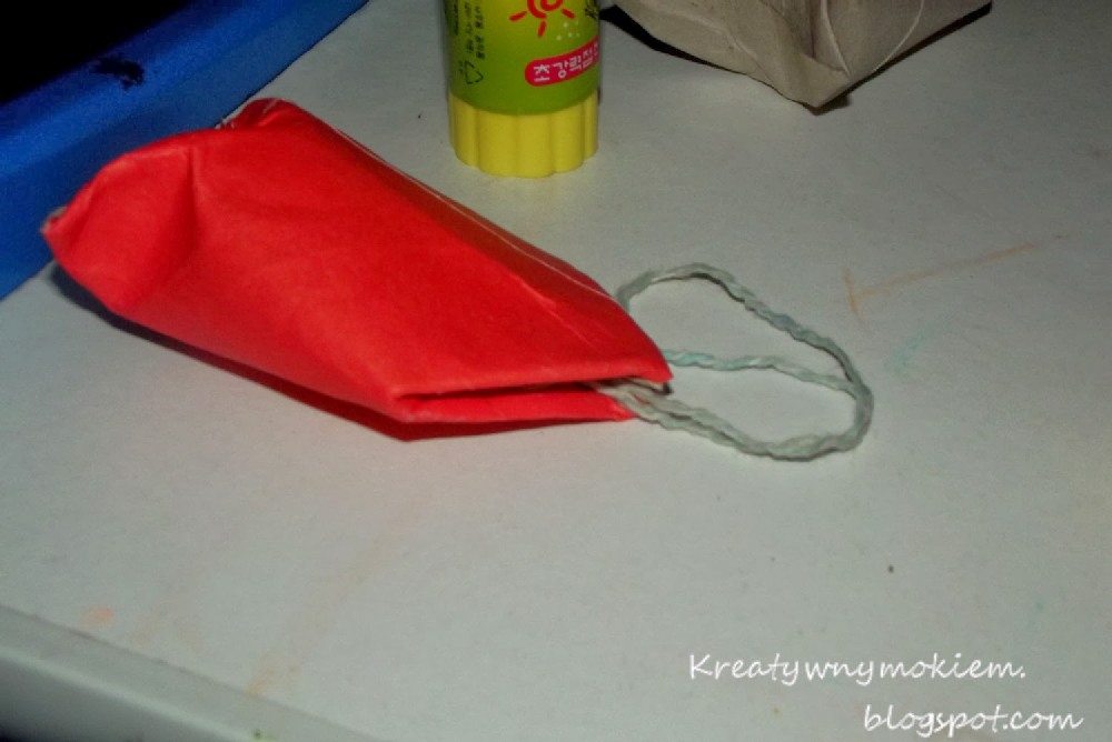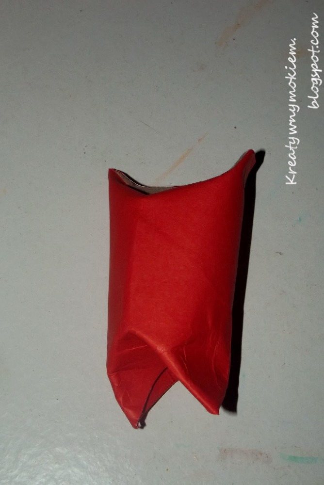 Jedną część spłaszczamy – to czapa Mikołaja. A nóżki wyginamy, tworząc butki.