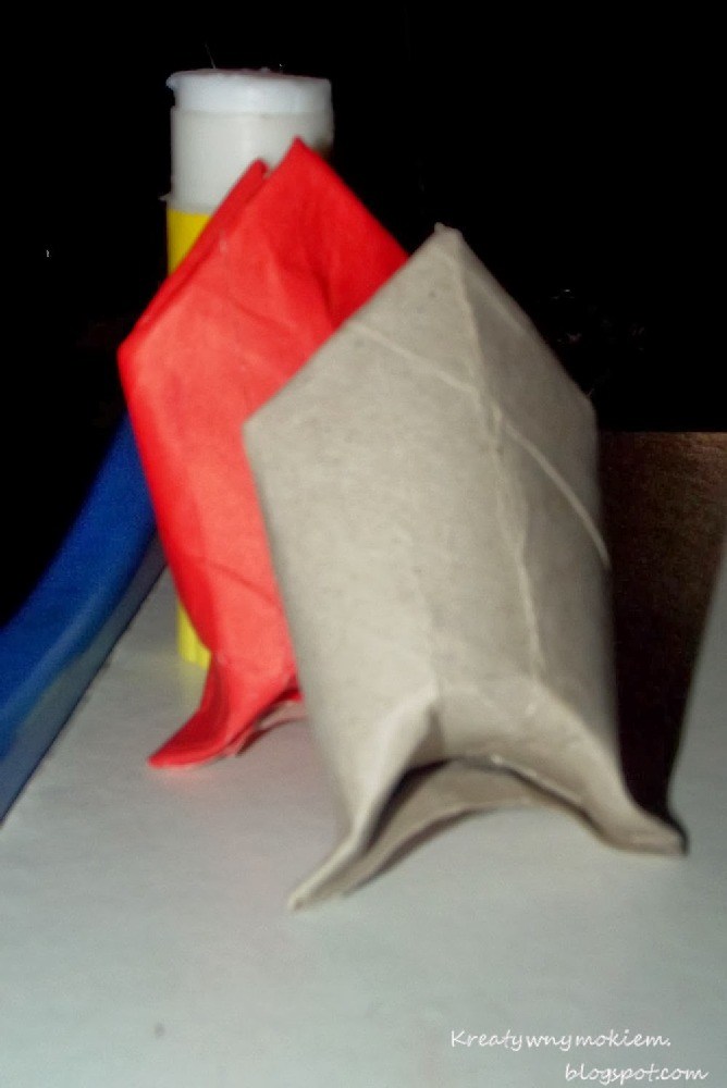 Ucinamy kolorowy papier tak by okrył całą rolkę. Smarujemy ją dokładnie klejem i oklejamy.