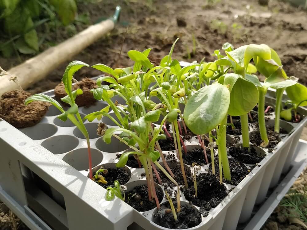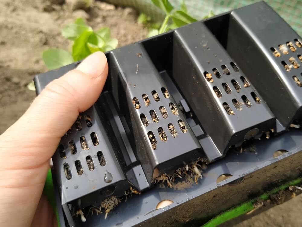 Po kilku tygodniach można było wysadzić sadzonki do gruntu. W tym celu musiałam odhaczyć rączki górnej części i opuścić ja na dół. Korki z dolnej podstawy pięknie wysunęły ziemię do góry i bez problemu mogłam je wyjąć.