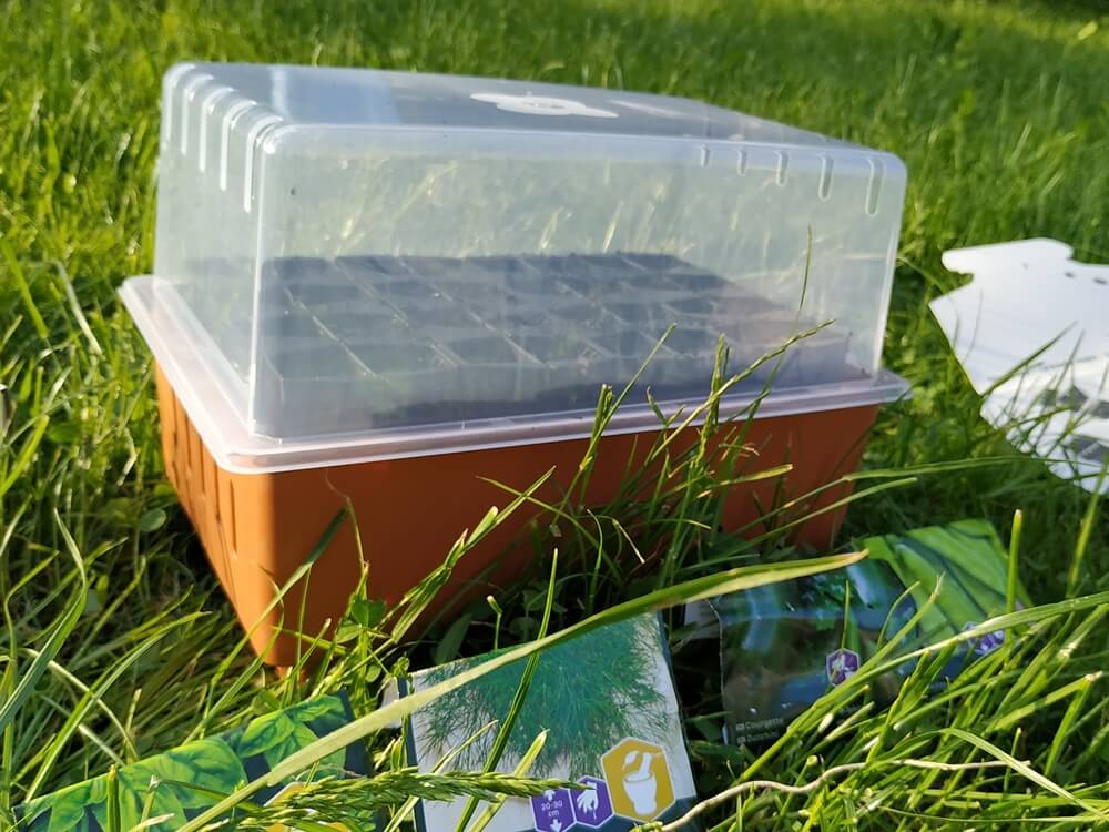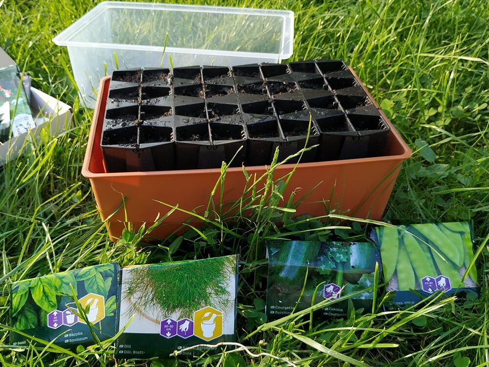 Pierwszy pomysł był taki, by wysadzić w nim pomidory, ale było za późno. Sadzonki już rosły, więc wykorzystałam inne nasiona, które otrzymałam w przesyłce. Posiałam więc bazylię, koper, cukinię i groszek. Teraz pozostało tylko założyć pokrywkę, ustawić w ciepłym, słonecznym miejscu i czekać na plon.