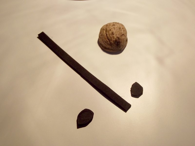 Z pianki wycięłam 2 łezki, to będą uszy naszej myszki oraz dłuższy cienki pasek na ogon. Uszka przykleiłam na kawałki taśmy dwustronnej na górze łupiny. Podobnie zrobiłam oczy i nosek.