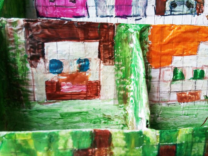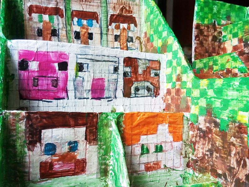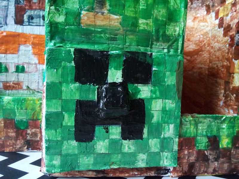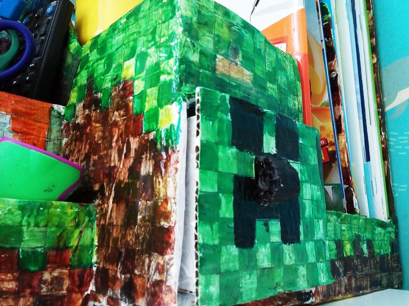Ten etap zajął mi najwięcej czasu. Minecraft, czyli całe miliony kwadracików! By ułatwić sobie malowanie, narysowałam kratownicę na organizerze. Farbami plakatowymi (mogą być akryle) namalowałam wcześniej uzgodnione postacie i zwierzęta oraz trawę i ziemię.