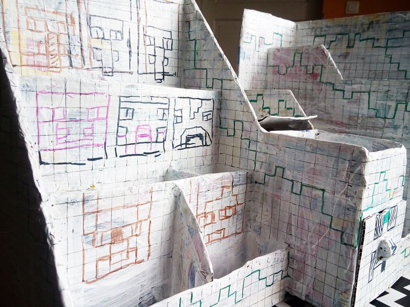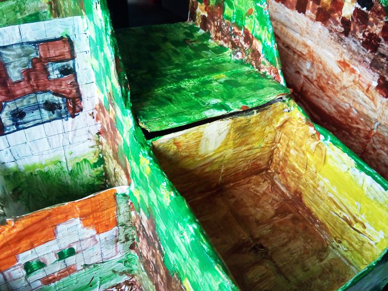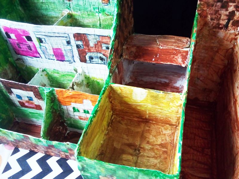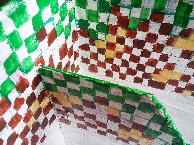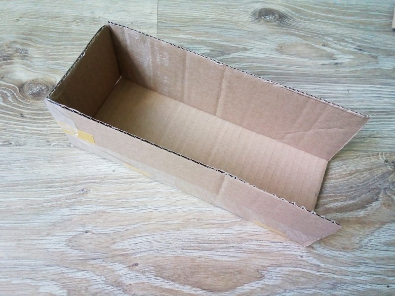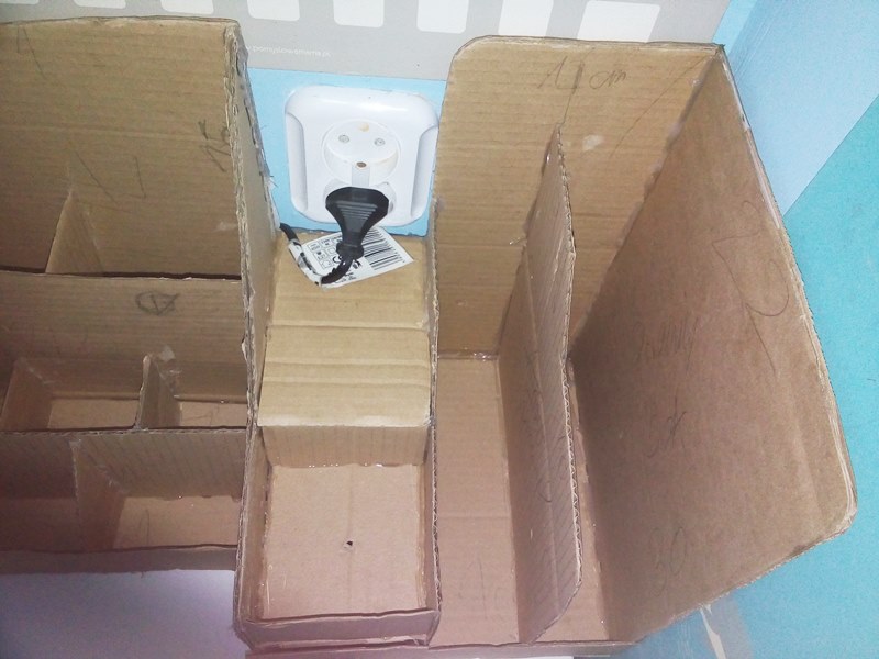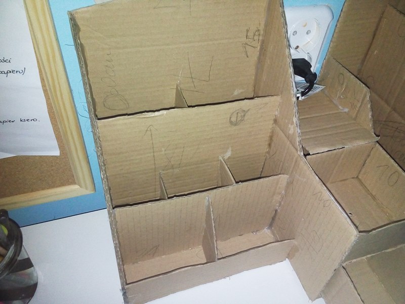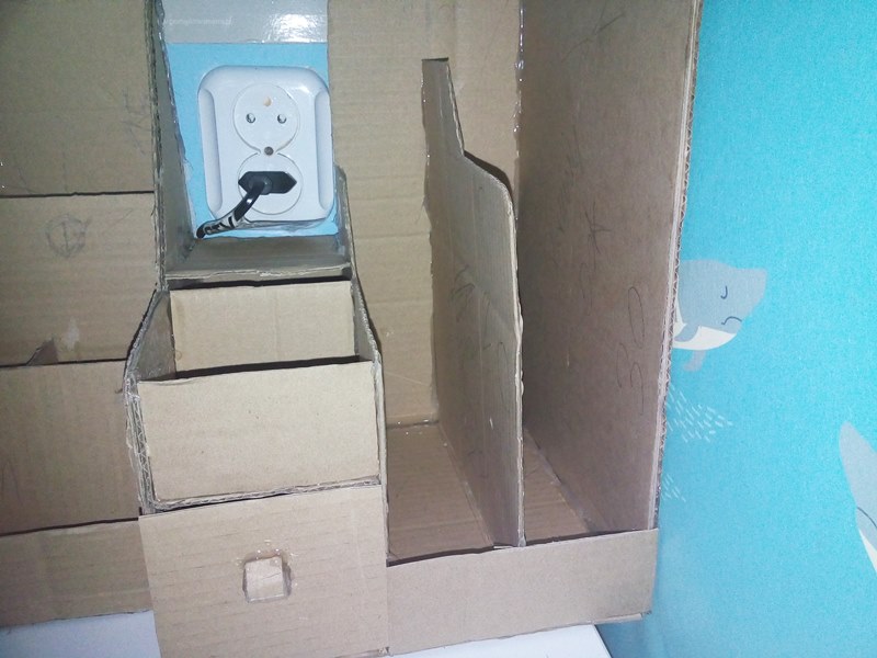 W szufladzie podłogę podkleiłam dodatkowym kartonem, by swobodnie mogła się wysuwać. Powstała ona ze ścinek kartonu, a sklejona klejem taśmą i klejem na gorąco.