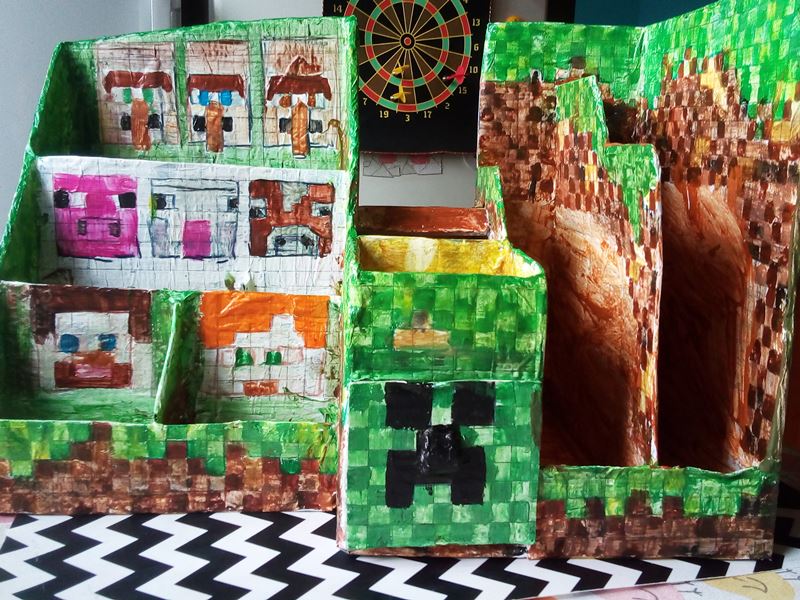 Długopisy, ołówki, pisaki, kredki! Ile tego ma każde dziecko. Jak nad tym zapanować?  Można zrobić słoiczki Lego na pisadła, takie jak tu-pojemniki Lego, a gdy nadal jest mało miejsca, polecam organizer z kartonu! Wykonacie go sami w domu z pomocą kleju na gorąco i farb. Ten jest świetny na fanów gry Minecraft, ale to od Was zależy, co na nim się znajdzie.