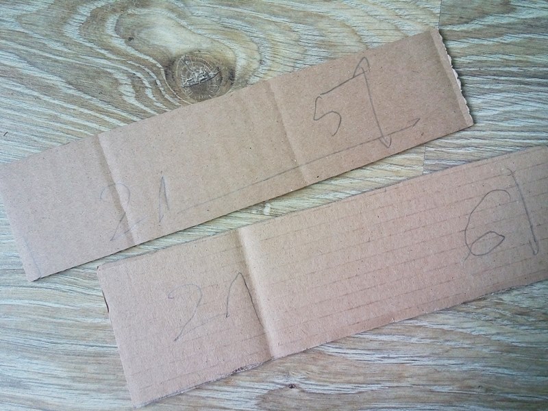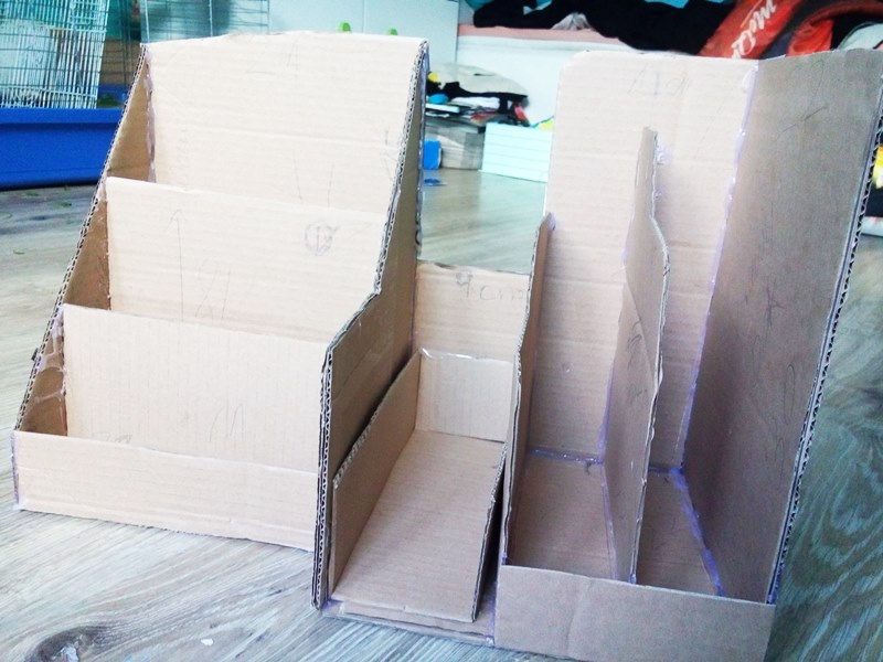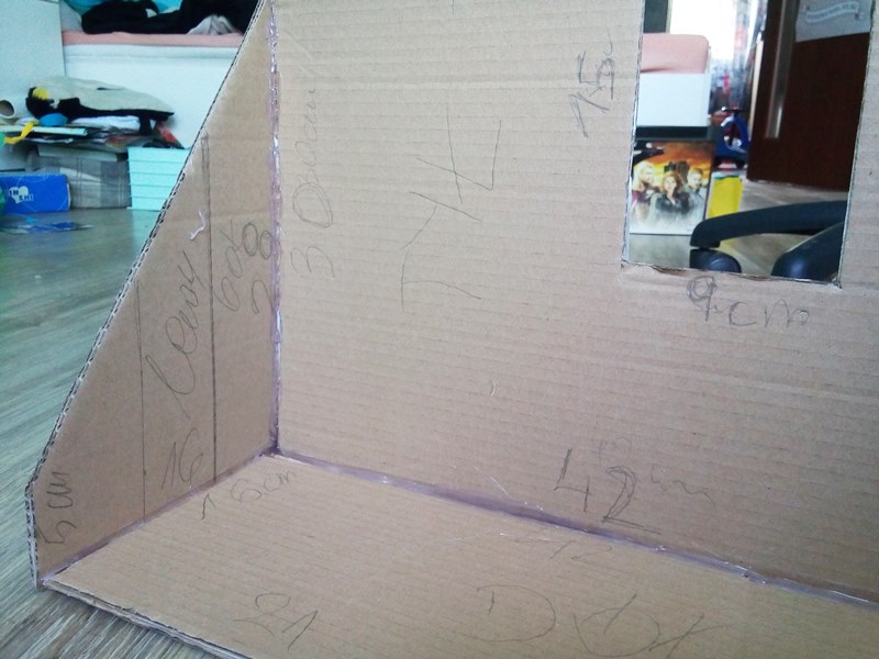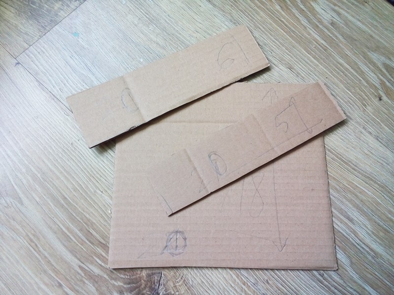 Pora przygotować potrzebne elementy. Na zdjęciach napisałam wymiary poszczególnych elementów oraz ich wymiary. Zdarzyło się, że musiałam odrobinę dociąć. Główny stelaż (boki, tył i spód) skleiłam podwójnie kartonem, by był stabilniejszy.
