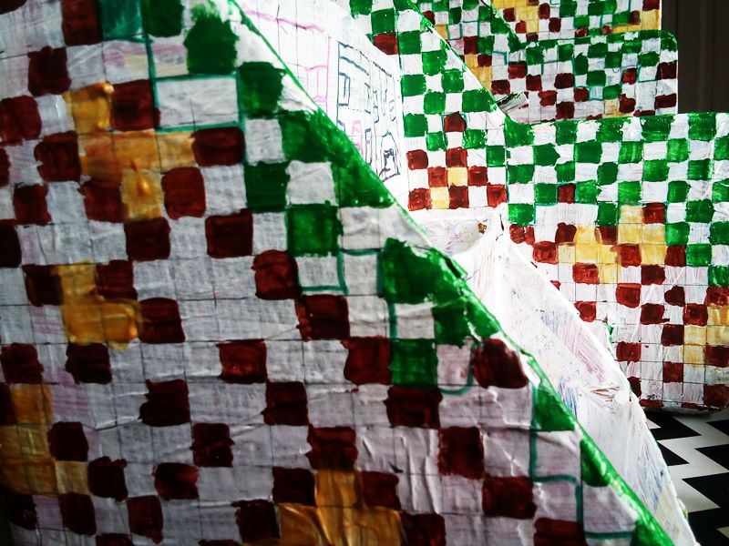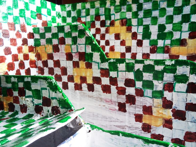 Ziemię malowałam ciemnobrązową, złotą i jasnobrązową farbą, trawę ciemną zielenią i żółtą. Gdy farba była jeszcze wilgotna, mokrym pędzlem rozsmarowałam kolejne elementy, by trochę się zlały i nie było widać miejsc łączenia poszczególnych kwadracików. Efekt wyszedł całkiem fajny.