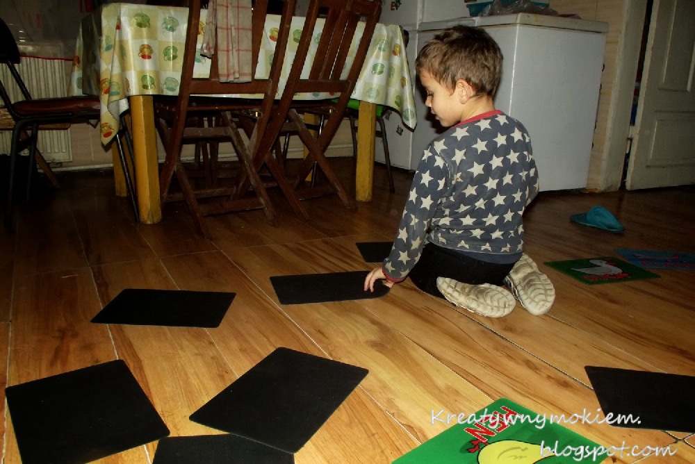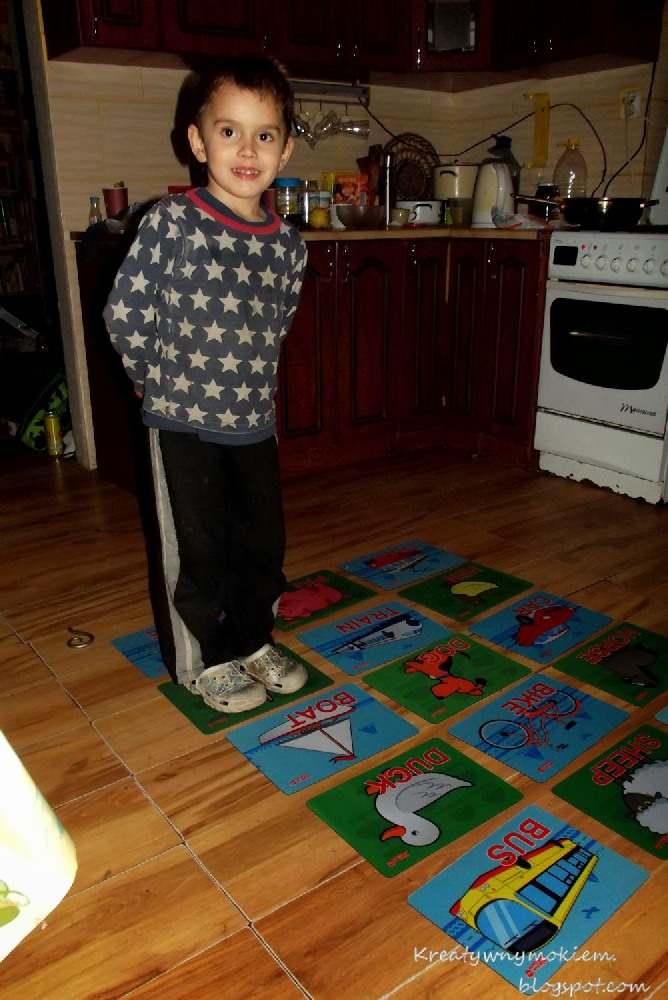 Układamy plansze blisko siebie i mówimy gdzie która rączka i nóżka. Początkowo dawałam mu proste zadania, ale z czasem coraz trudniejsze lub po angielsku. Śmiechu co nie miara, gdy nogi się rozjeżdżały, ręce gdzieś uciekały 🙂 Potem przyszła pora na mnie i zemścił się oj zemścił. Mamie o mało nogi się nie połamały od tych wygibasów!