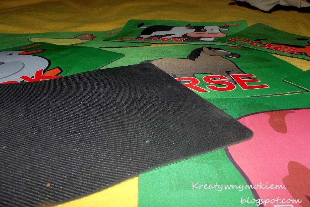 Każda plansza jest na gumowym podkładzie. Na wierzchniej stronie jest wysokiej jakości materiał, lekko śliski, a na nim obrazek oraz wyraz po angielsku. Karty są rozciągliwe, ale mimo rozciągania, przeciągania, miętolenia nic się nie dzieje. Kształt jest taki sam jak na początku. Materiał również nie ulega zadzieraniu czy innym uszkodzeniom. Jeśli się zabrudzą, wystarczy wilgotną ściereczką je wytrzeć. No nic prostszego!