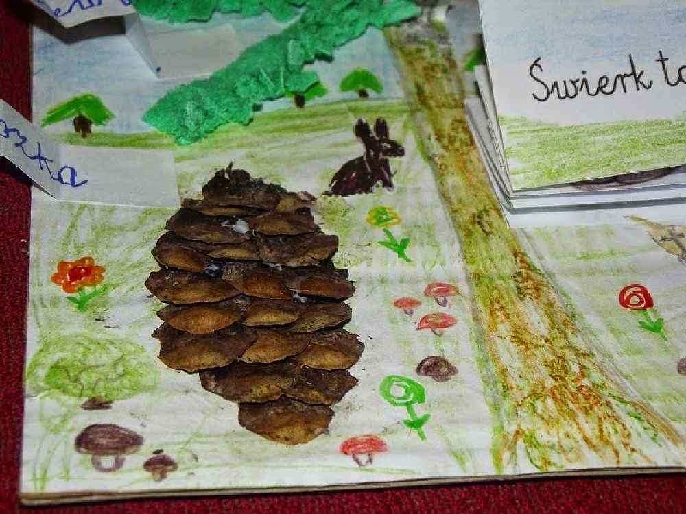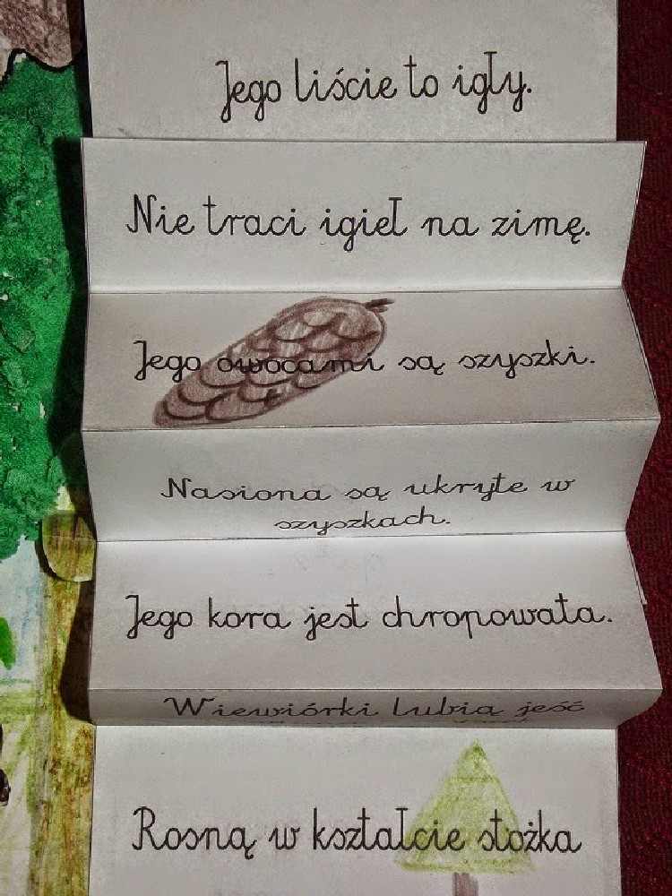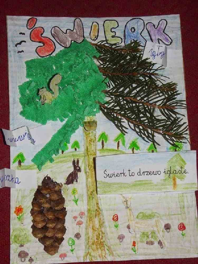 Miesiąc temu ogłoszono konkurs na drzewo lasu. Był to konkurs, gdzie pracę się wysyłało. Po otrzymaniu informacji, zabraliśmy się do pracy. Wybraliśmy świerk. W lesie ich sporo, na podwórku kolejne kilka sztuk. Forma pracy A4, płaska. Oto jak opracowaliśmy temat tego drzewa.