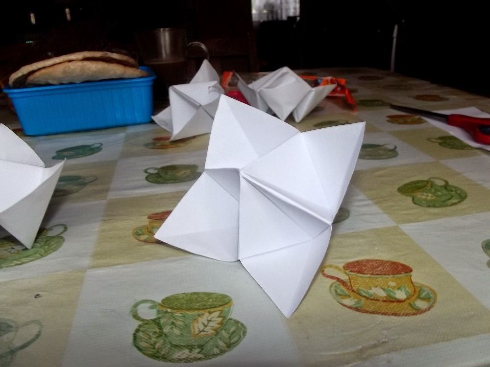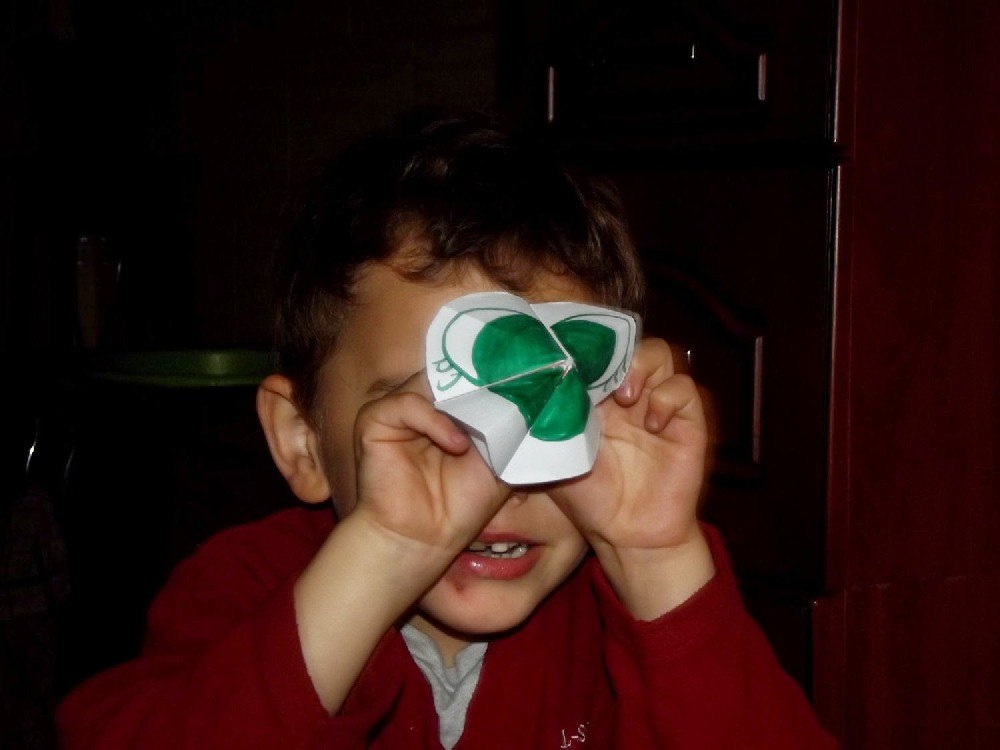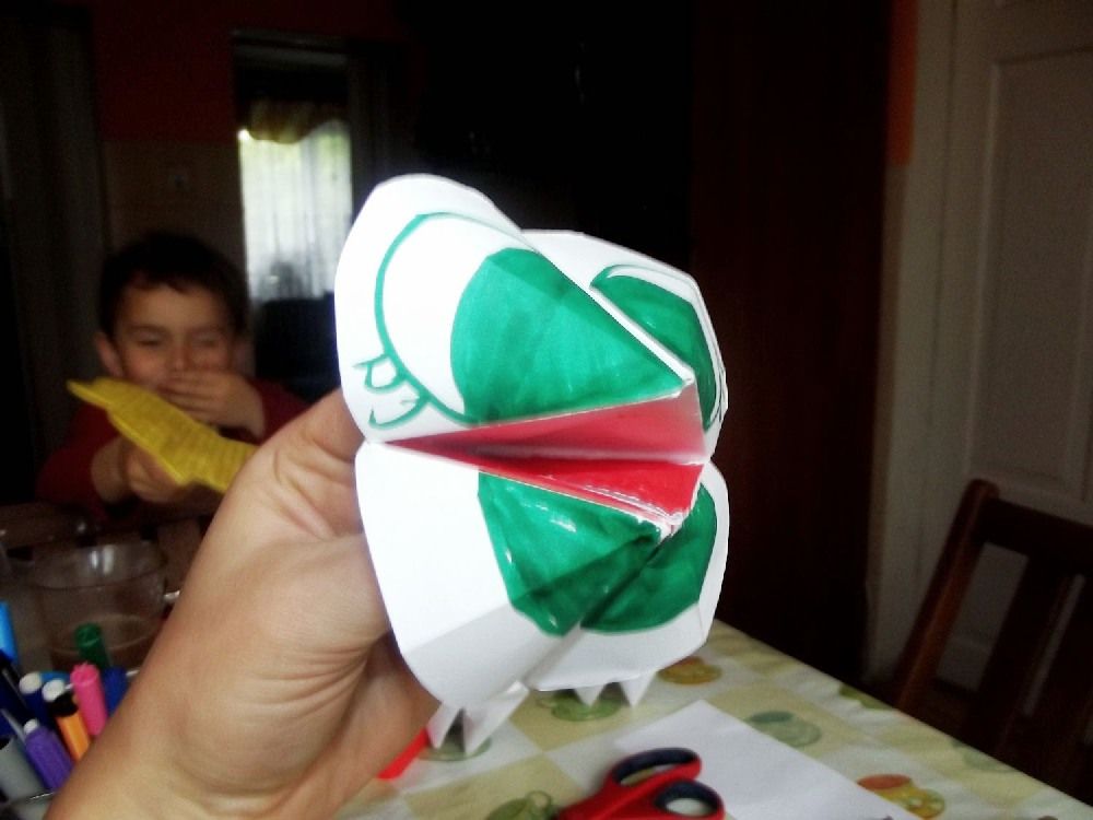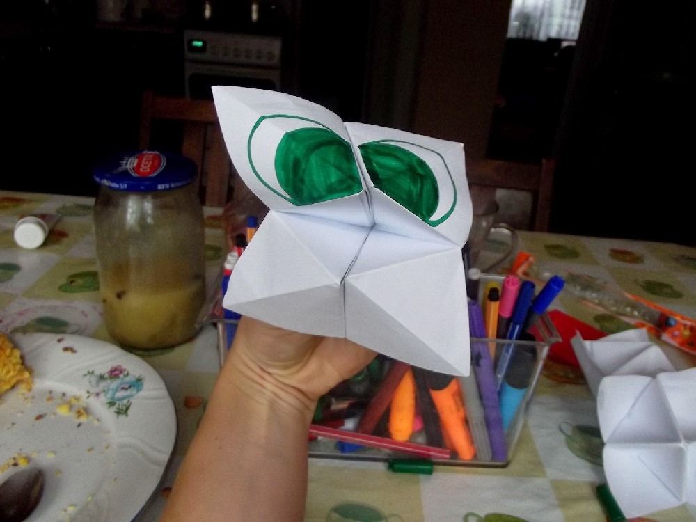 Jest to pierwsza zabawka origami jaką robiłam od dziecka! A to za sprawą Adasia. Z przedszkola X czasu temu przyniósł takie 3 zabaweczki. Przypominało mi to żabę więc takową zrobiłam. Wykonanie jest proste. Potrzebujemy tylko kartkę papieru i kilka pisaków.