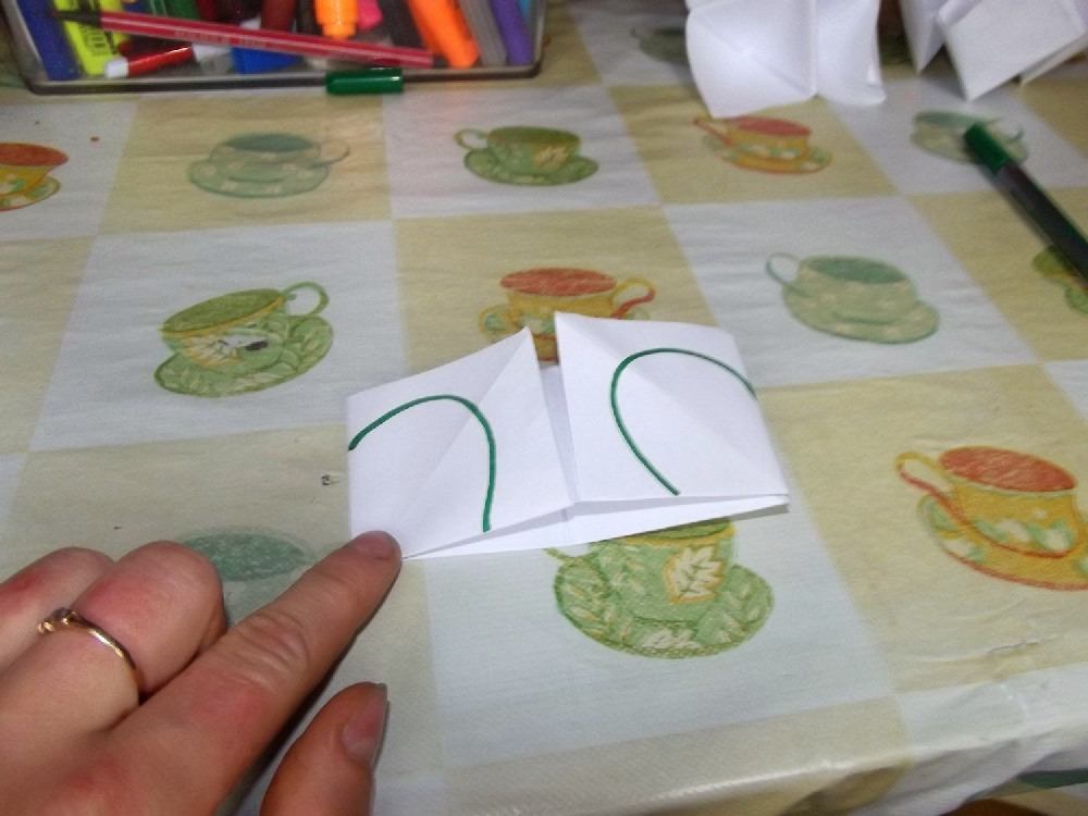Teraz musimy ją „złożyć”. W miejscu gdzie są pojedyncze płatki wkładamy palce i składamy do środka.