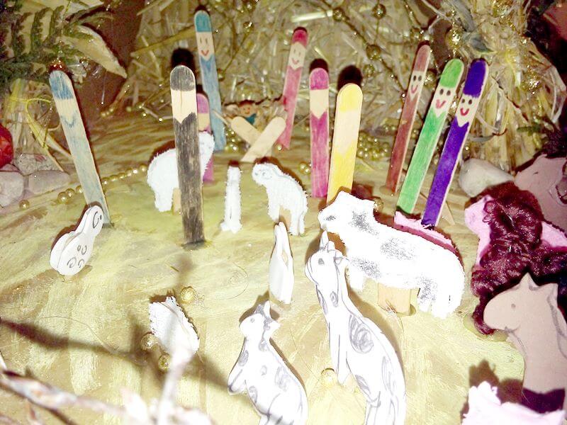 - Ludzi zrobił z patyczków po lodach. Tak samo aniołów ( z pianki wyciął skrzydła).