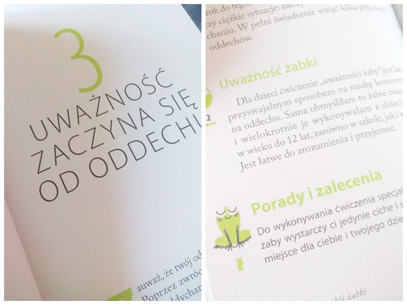 Każdy rozdział to kilka słów wstępu, o czym on będzie, przykład z życia i zadanie do zrobienia w domu, czyli propozycja ćwiczeń relaksacyjnych. Warto pamiętać, że one mają być przyjemne! Nie zmuszamy się do nich, nie robimy nic przeciw sobie. Nie zawsze mamy ochotę by wysiedzieć 15 min bez ruchu. Dzieci wiedzą o tym najlepiej. Jednak trening czyni mistrza. Regularne, wesołe ćwiczenia poprawią uważność, koncentrację i ogólne samopoczucie dziecka i rodzica.