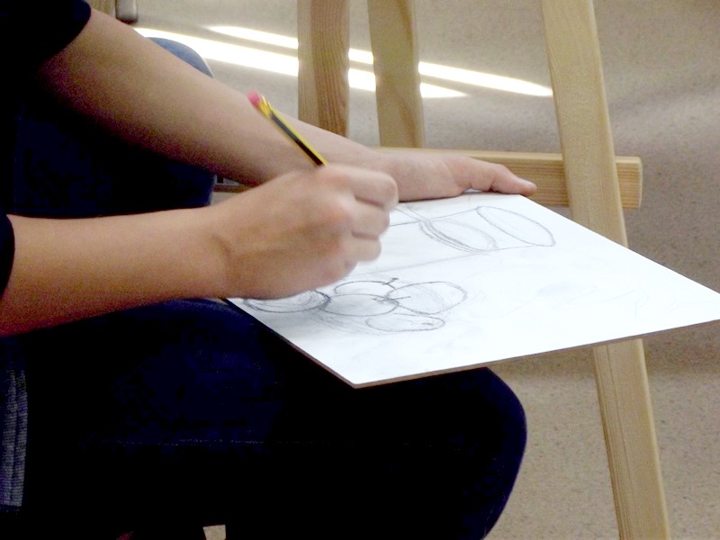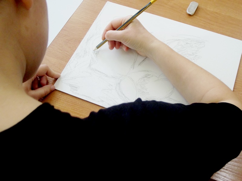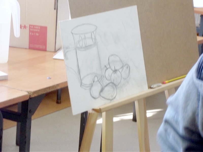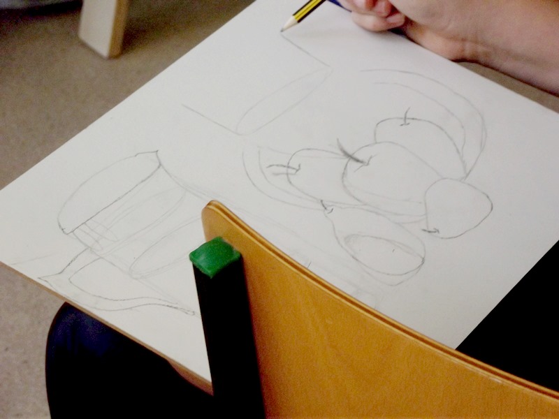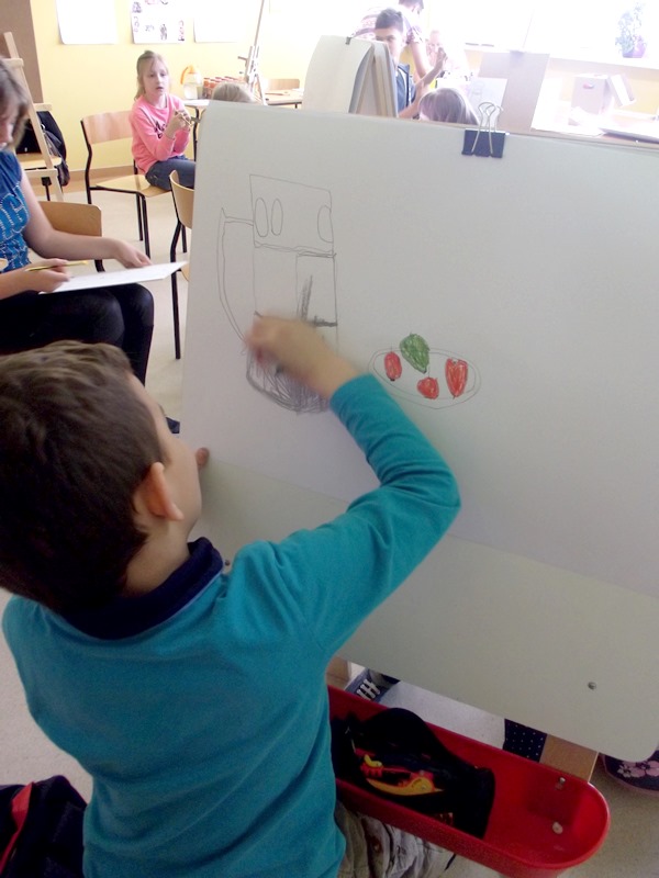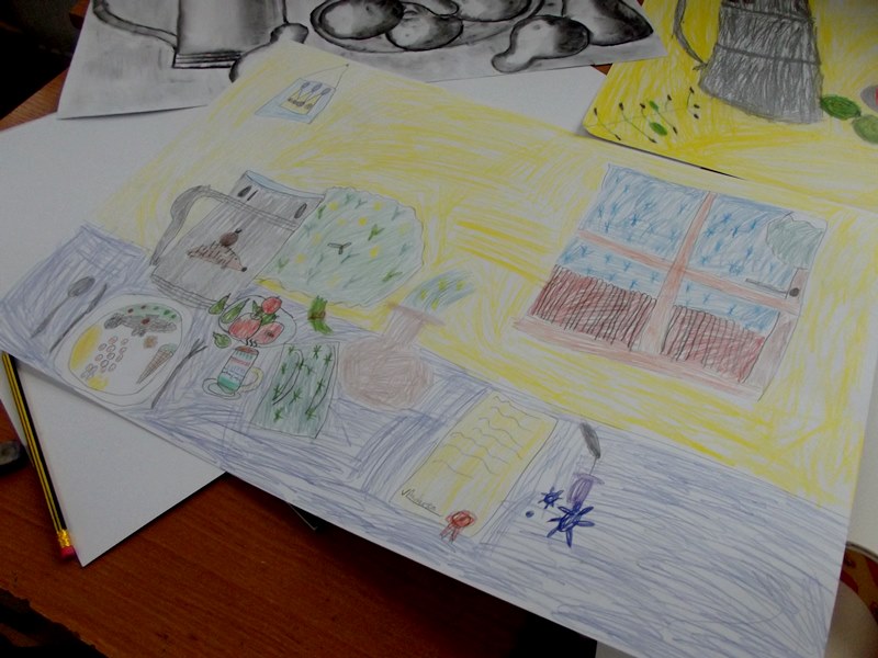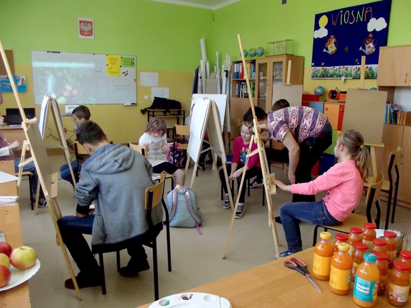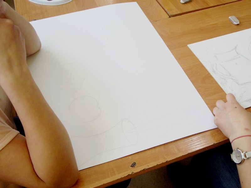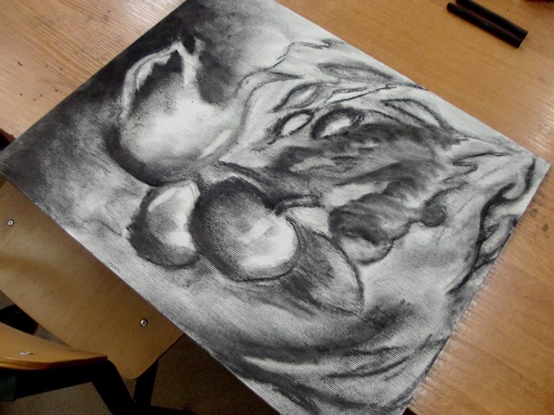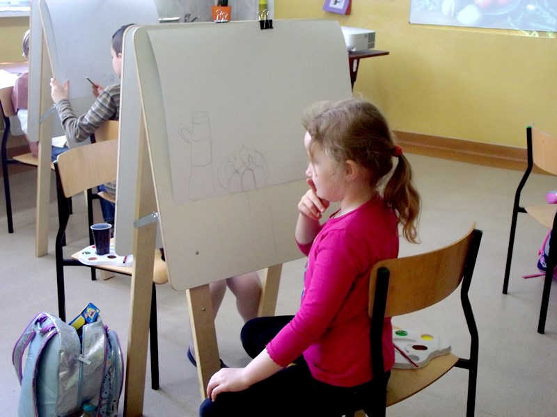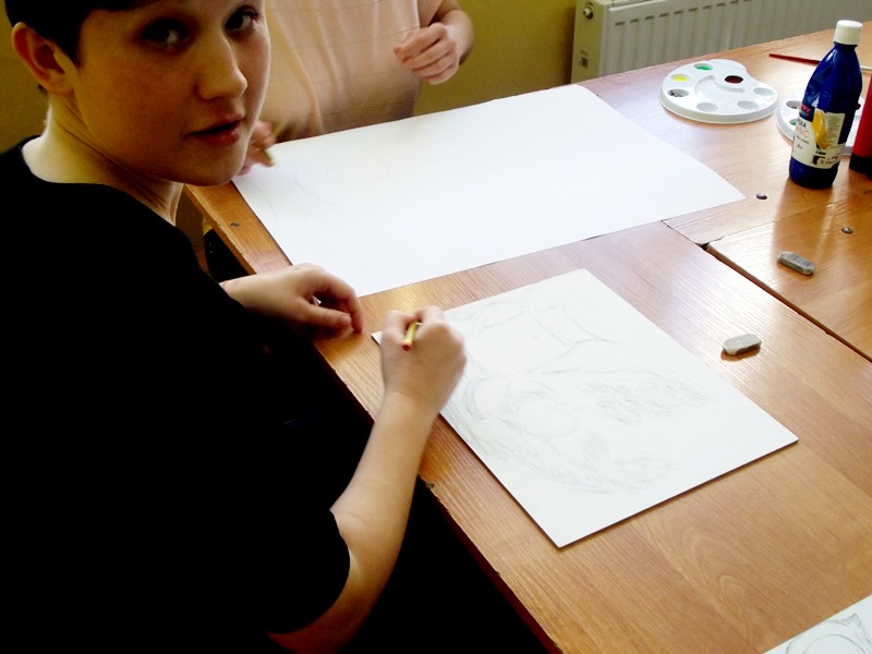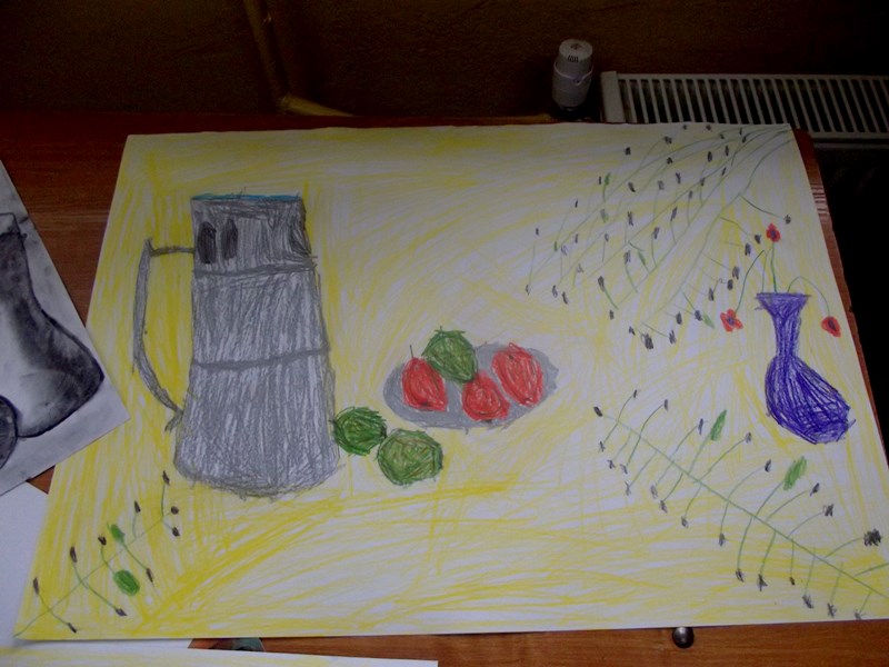 Do wyboru do koloru! Mogliśmy malować na podobraziu farbami lub węglem, na papierze kredkami lub farbami. Pierwszy temat to „martwa natura”. Wyobraźnia miała odegrać to zasadniczą rolę, nie trzymamy się sztywno kolorystyki.