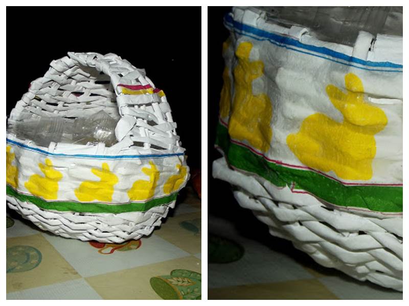 - Z bibuły możemy zrobić trawkę. Tniemy bibule na pasku o szerokości ok 4 cm.. Przecinamy co kawałeczek do połowy wysokości paska ( ok 2cm) bibule i rozwijamy i mamy trawkę. Przyklejamy ja do jajka tak by powstała łąka. Z innych kolorów możemy zrobić kwiatki. Po bokach jajka robimy małe dziurki i przewlekamy do nich wstążkę. Zawiązujemy na końcach i teraz mamy za co trzymać nasz koszyczek-jajo 🙂